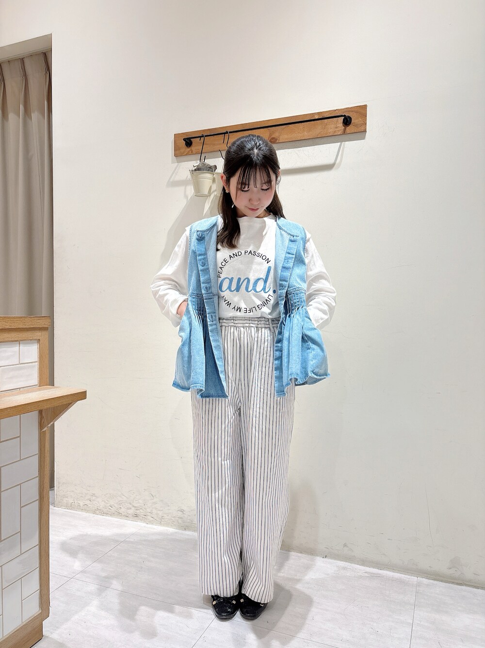 ご覧いただきありがとうございます🌼 ロンTのブルーのロゴとデニム生地のベストを組み合わせてまとまりよく◎ ストライプのパンツを合わせてアクセントに⚡️