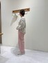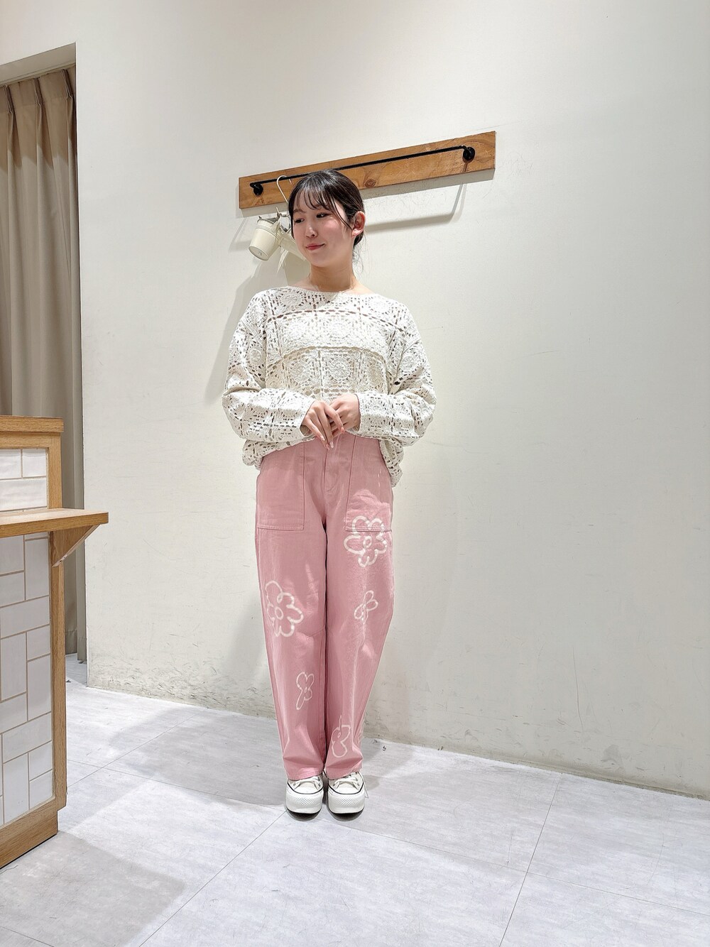 ピンクのパンツでアクセントに⚡️💖 お花のプリントが可愛らしさを引き立たせてくれますね◎ 抜け感のあるかぎ針風ニットで大人っぽさもプラス⤴️