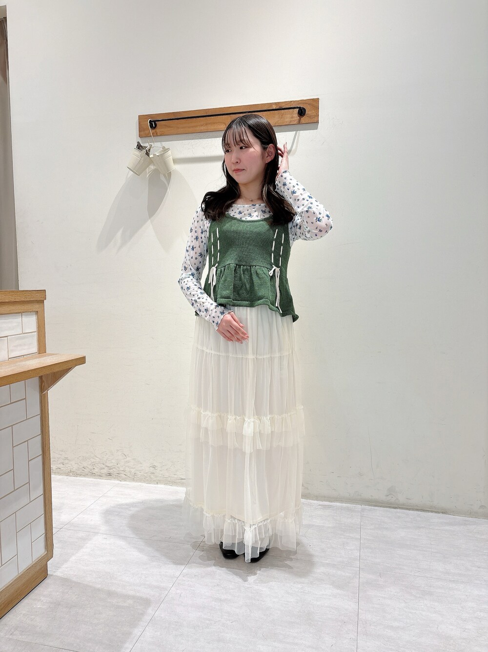 ご覧いただきありがとうございます🌼 小花柄のシアーカットソーが春らしくておすすめです💡 小花の色に合わせてグリーンのビスチェを合わせて統一感🆙