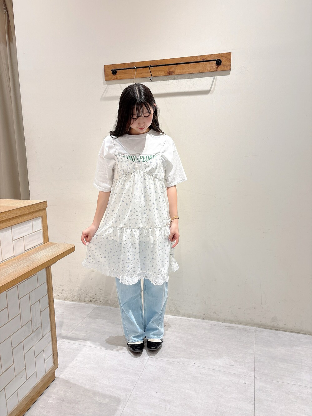 ご覧いただきありがとうございます🌼 小花柄ワンピースがシンプルなコーデを彩ってくれますね💐♡ 裾にレースがついているのも大きなポイントです◎ Tシャツの下に合わせてレースをちらつかせるのもかわいいです🫶🏻