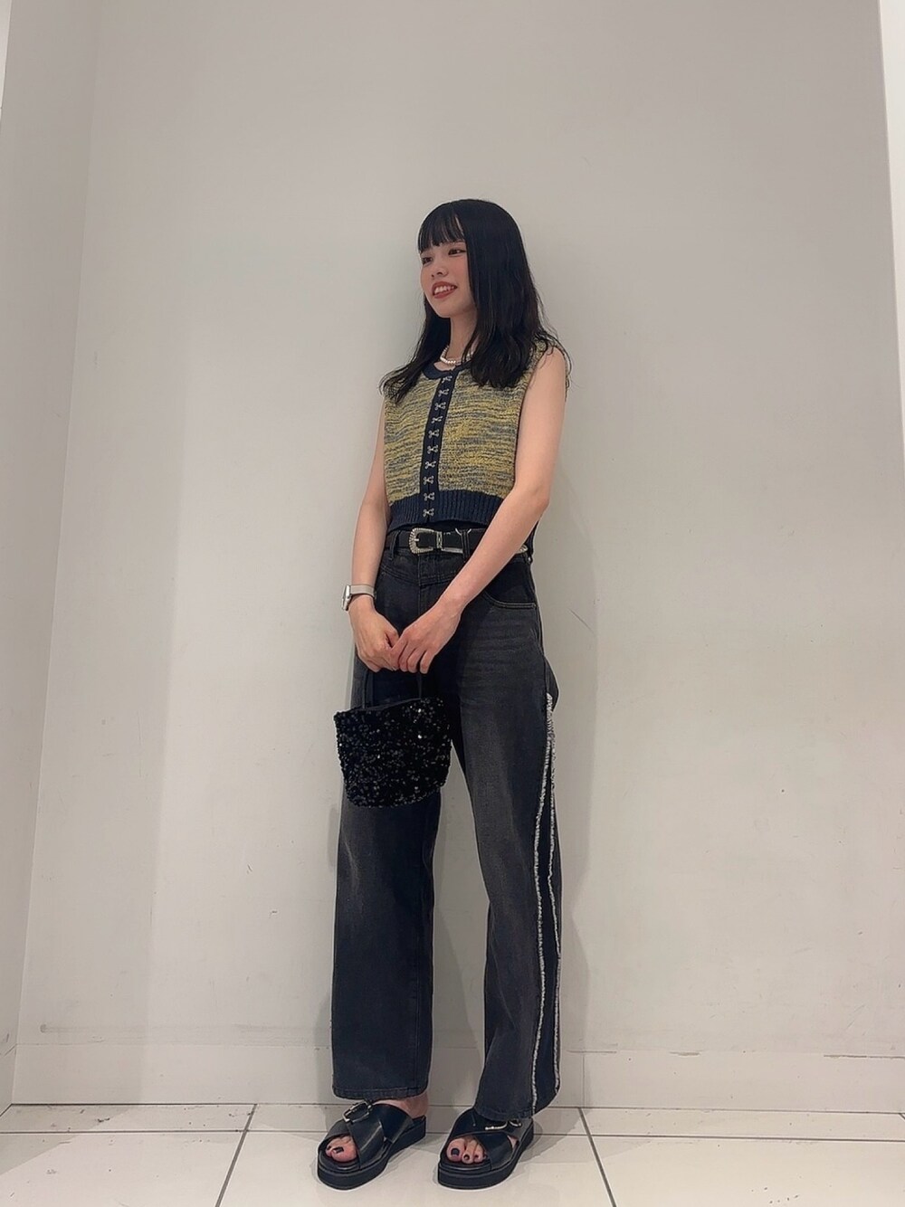 ななみ(SENSE OF PLACE 天神地下街)のベスト「フロントホッククロップドニットトップ」を使ったコーディネート