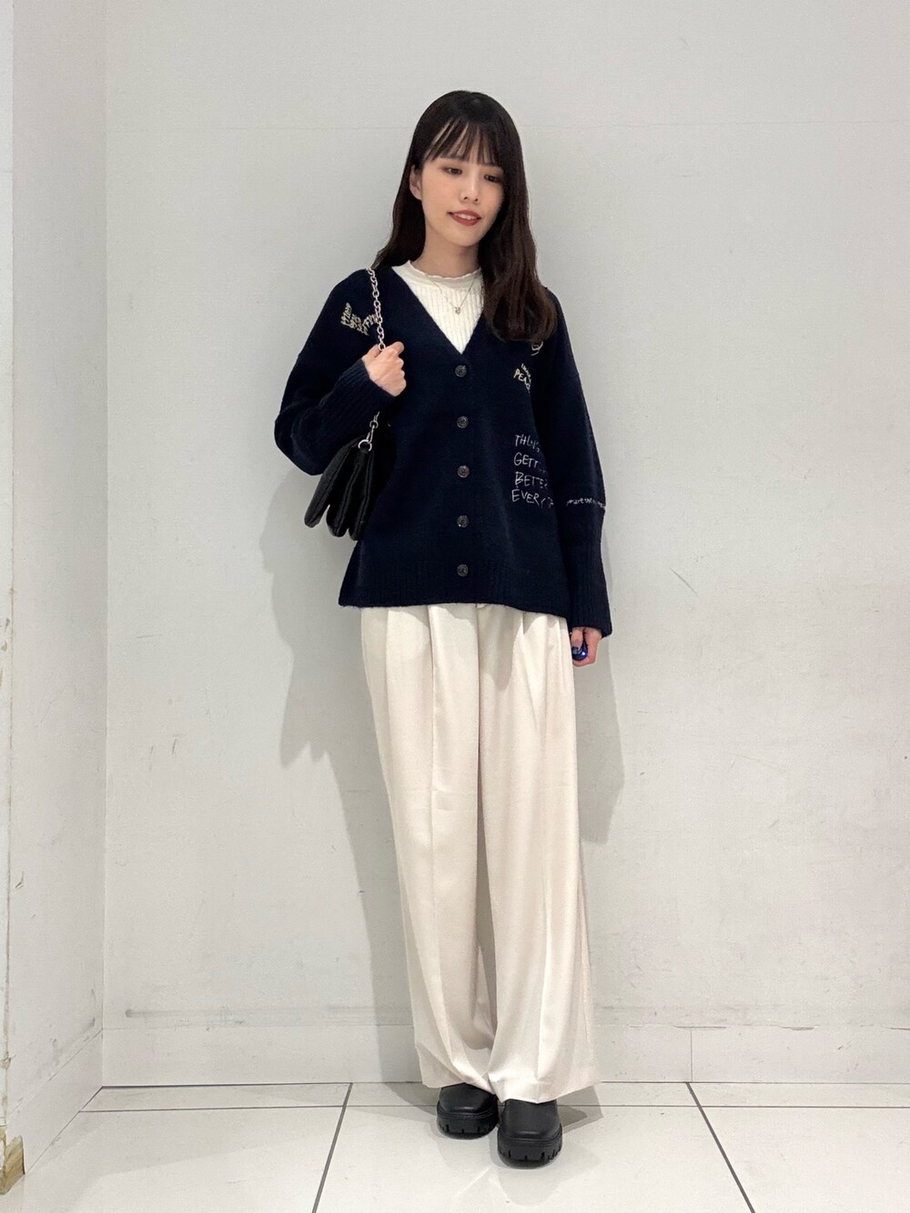 ななみ(SENSE OF PLACE 天神地下街)のカーディガン/ボレロ「シシュウVネックカーディガン」を使ったコーディネート