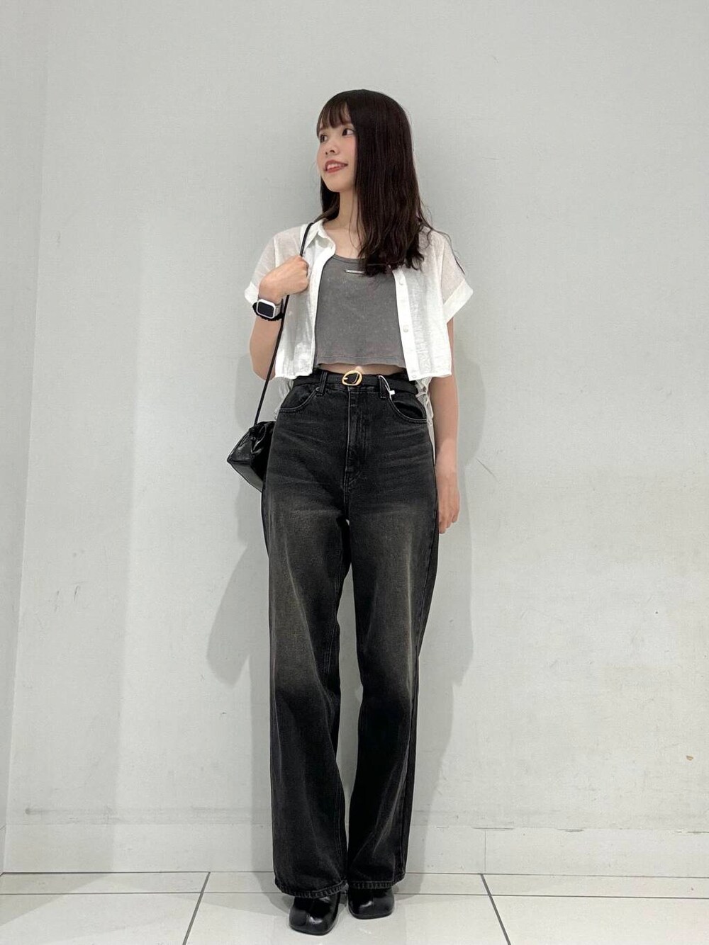 ご覧いただきありがとうございます!✨ クロップド丈のトップス×デニムでコーデを組んでみました🖤 デニムがハイウエストになっているのでスタイルアップ効果も抜群です◉