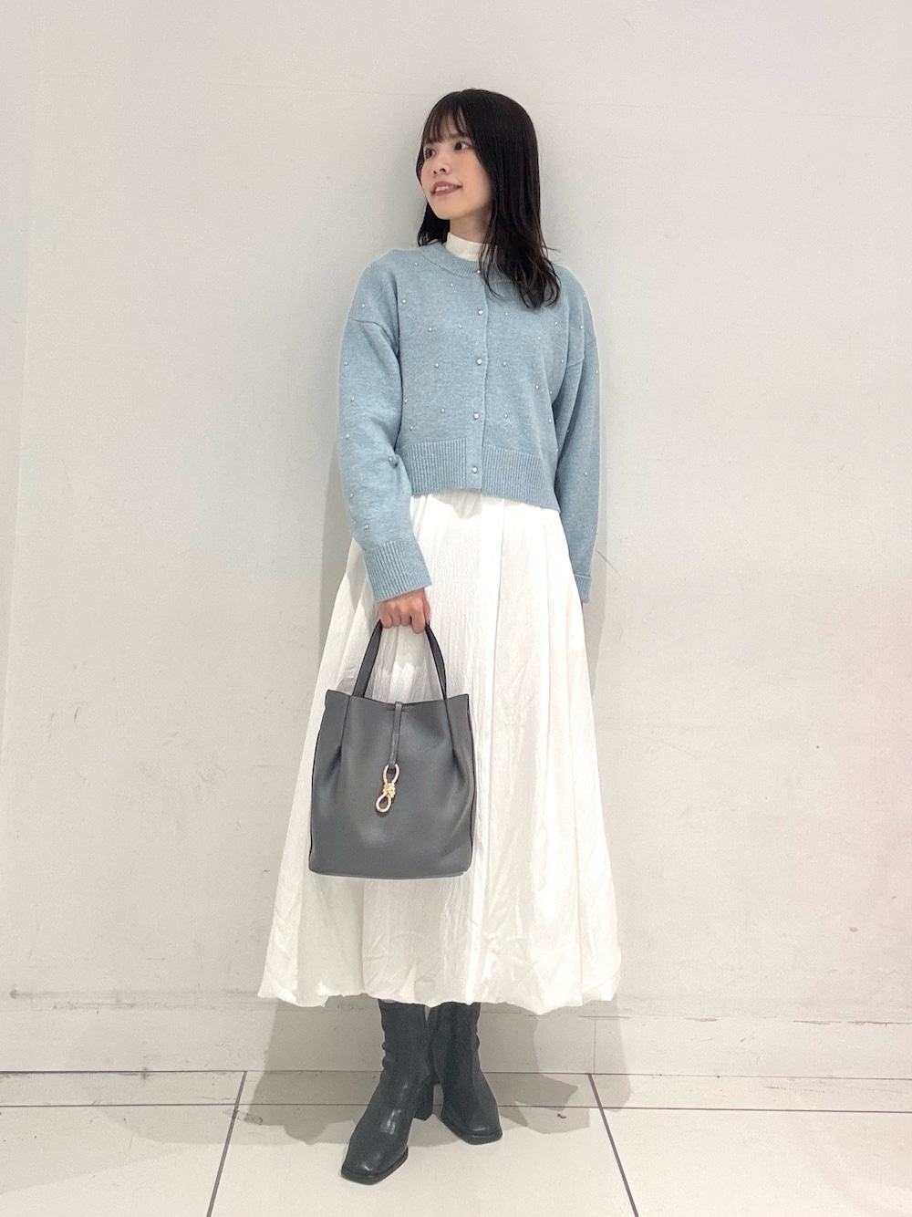 ご覧いただきありがとうございます!✨ 新作カーディガンを使用したコーデです! 店頭入荷後からすごく人気なカーディガンなんです! ボールビーズがアクセントになっており、シンプルなコーデにすごく映えます🙌🏻