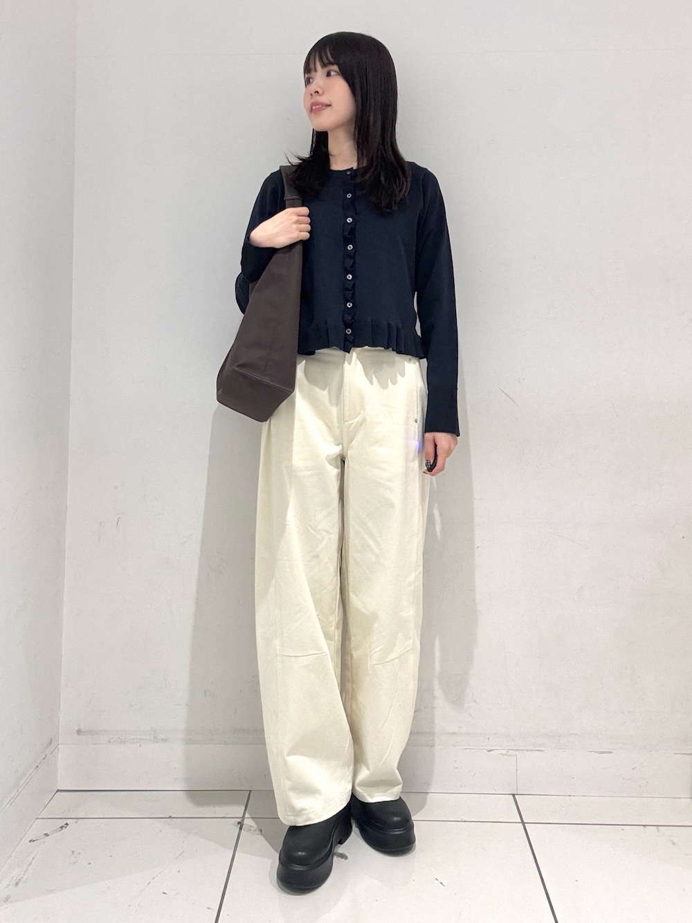 ご覧いただきありがとうございます!✨ 店頭でも大人気な新作アイテムを使用したコーデです! こちらのカーディガンは、フリルデザインがポイントでオンオフ問わず使いやすいアイテムとなっております◎ ボトムはトレンドのバレルレッグパンツで、程よいカーブデザインが脚を綺麗に見せてくれます👀 169cmMサイズ着用しております!! よりカジュアルに着こなしたい方はLサイズでダボッと着るのもおすすめです🙌🏻