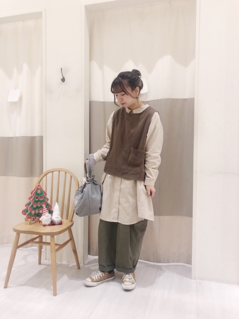 ご覧いただきありがとうございます🌞 以前ご紹介した前後着ベストの着まわしコーデです! 店頭でも人気のシャツチュニックと 合わせました🎅✩ 手持ちの洋服に合わせるだけでいつもと 違う雰囲気にできるので、おすすめアイテム です(^O^)🌼