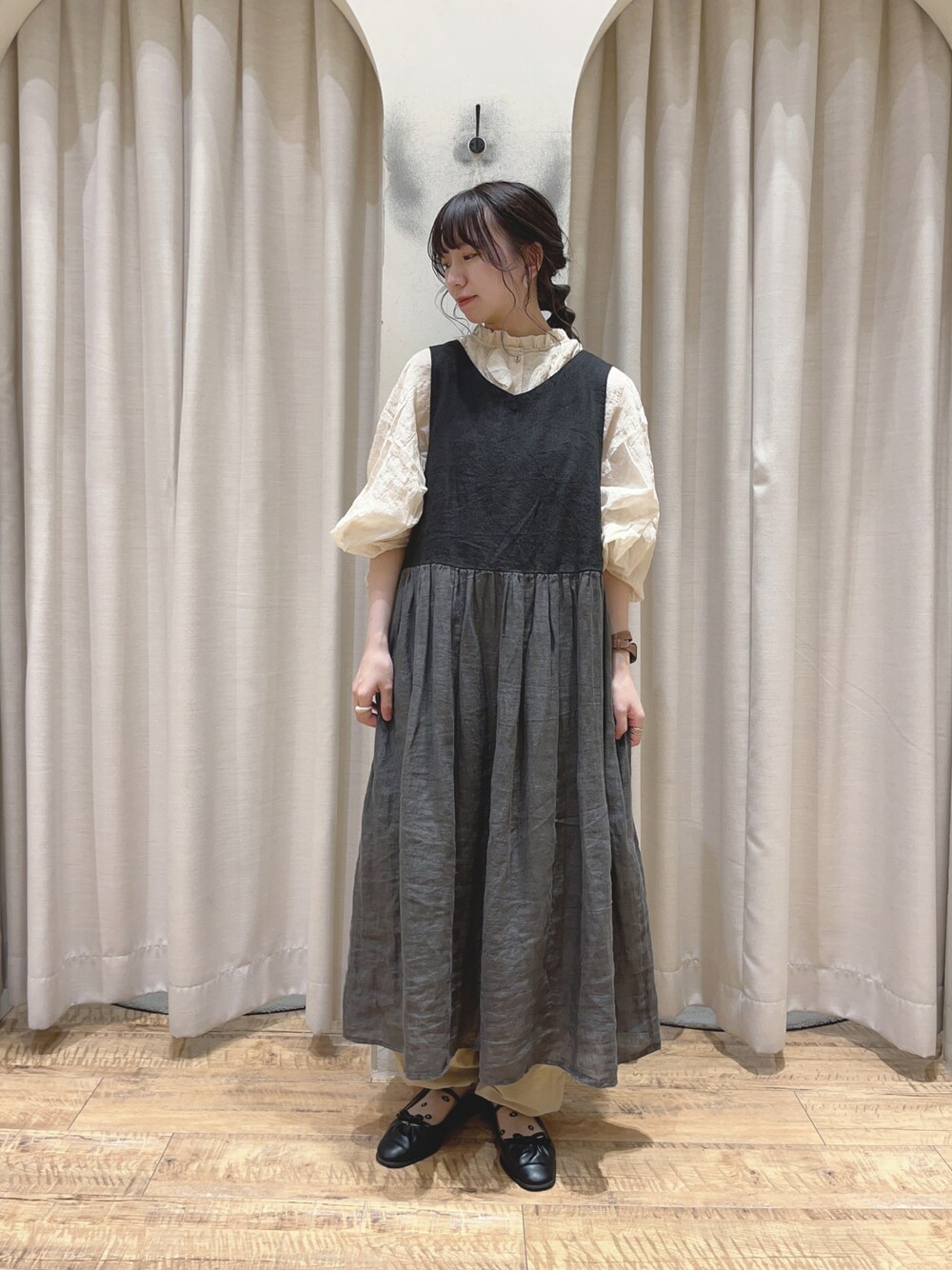ご覧いただきありがとうございます🍇 TSUHARUの切替ノースリワンピースを 着用しました^^ 麻素材でスカート部分は透け感があり 今から涼しく着ることができます👗 秋はレースのペチパンツなど合わせて 重ね着が楽しめそうなアイテム🐻 ⠜ インナーをシンプルにして、ベロアのリボンを 前に着用してもポイントになって可愛いです☺︎ ※府中店では全色完売しております🙇♀️