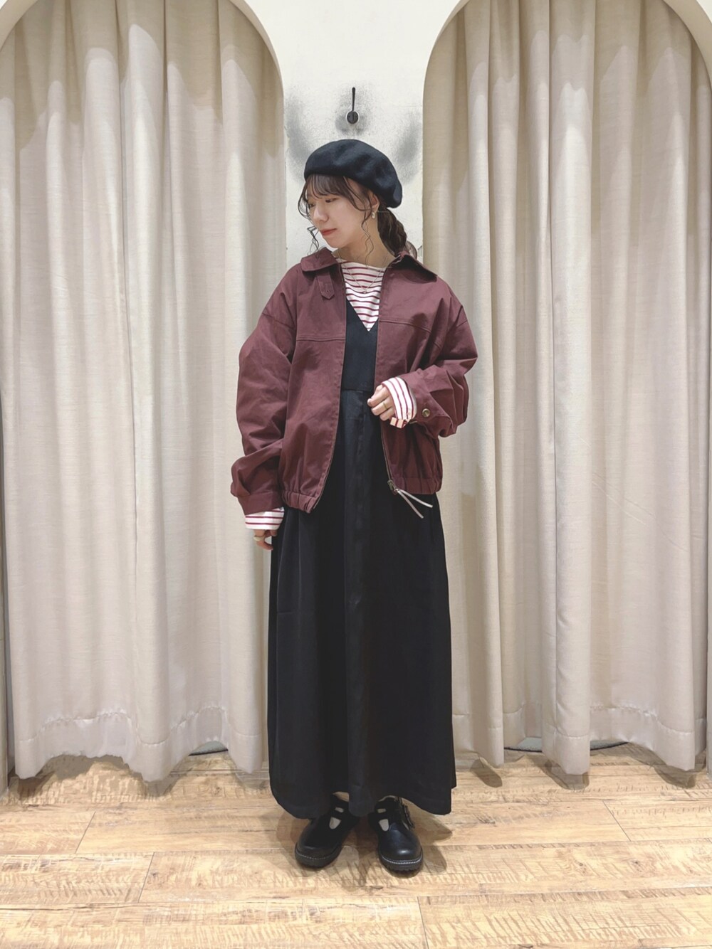 ご覧いただきありがとうございます🌟 ジップアップブルゾンを着用しました^^ ボルドーのカラーが秋らしいですよね🍇 襟にボタンがついているので、 ハイネックのように立てれば防寒対策にもなります◎ カジュアルにもガーリーにも合わせられるので 着回ししやすいアウターです☺︎ 店頭やオンラインショップでご覧ください✨