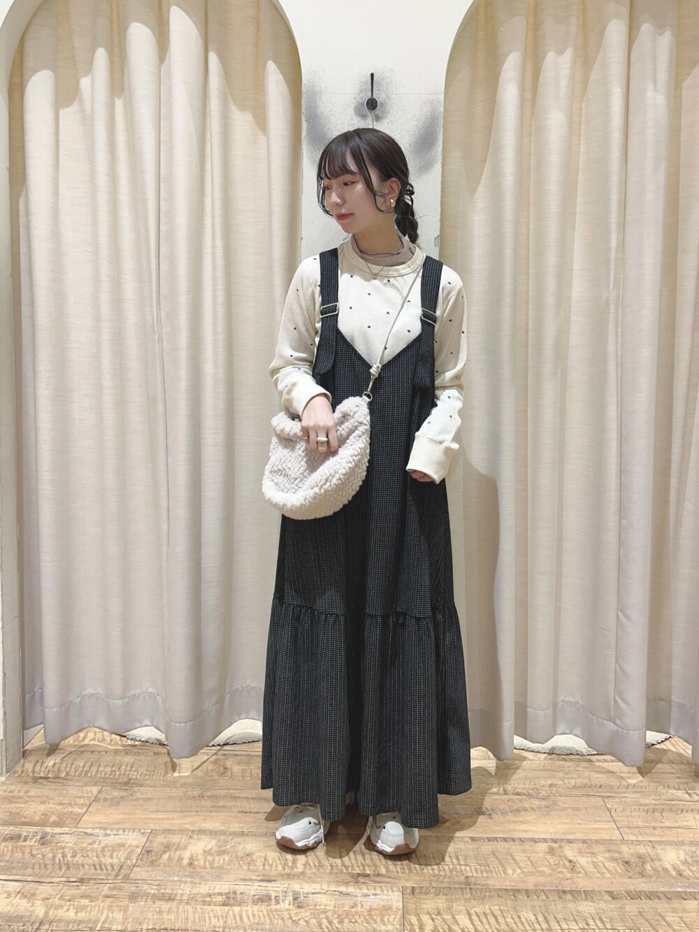 ご覧いただきありがとうございます🎅 ˎˊ˗ ハート柄が可愛いカットソーに ジャンパースカートを合わせました^^ 長さ調節ができるので、低身長の方も 嬉しいワンピース☺︎ 合わせるもので雰囲気を変えられるので カジュアルから綺麗めにも着回しができそうです⟡.꙳ 私は着用カラーをどちらもゲットしました👗 店頭やオンラインショップでご覧ください🛍 ◝✩