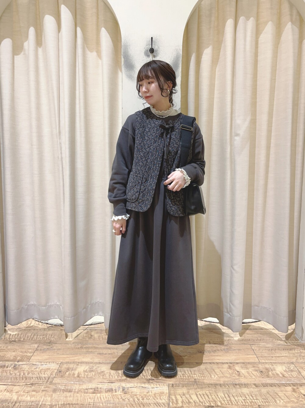 ご覧いただきありがとうございます🌼 ˎˊ˗ 大人気のキルティングベストを着用しました^^ リバーシブルで両面ともポケット付きが嬉しいです⟡.꙳ 花柄がコーディネートのポイントになって 可愛いですよね☺︎ ワンピースは裏起毛で暖かく着心地も◎ 後ろにスリットが入っていたり、ウエストは 絞れるデザインなのですっきりしたシルエットで着用できます👗 店頭やオンラインショップでご覧ください🛍 ⸝⋆