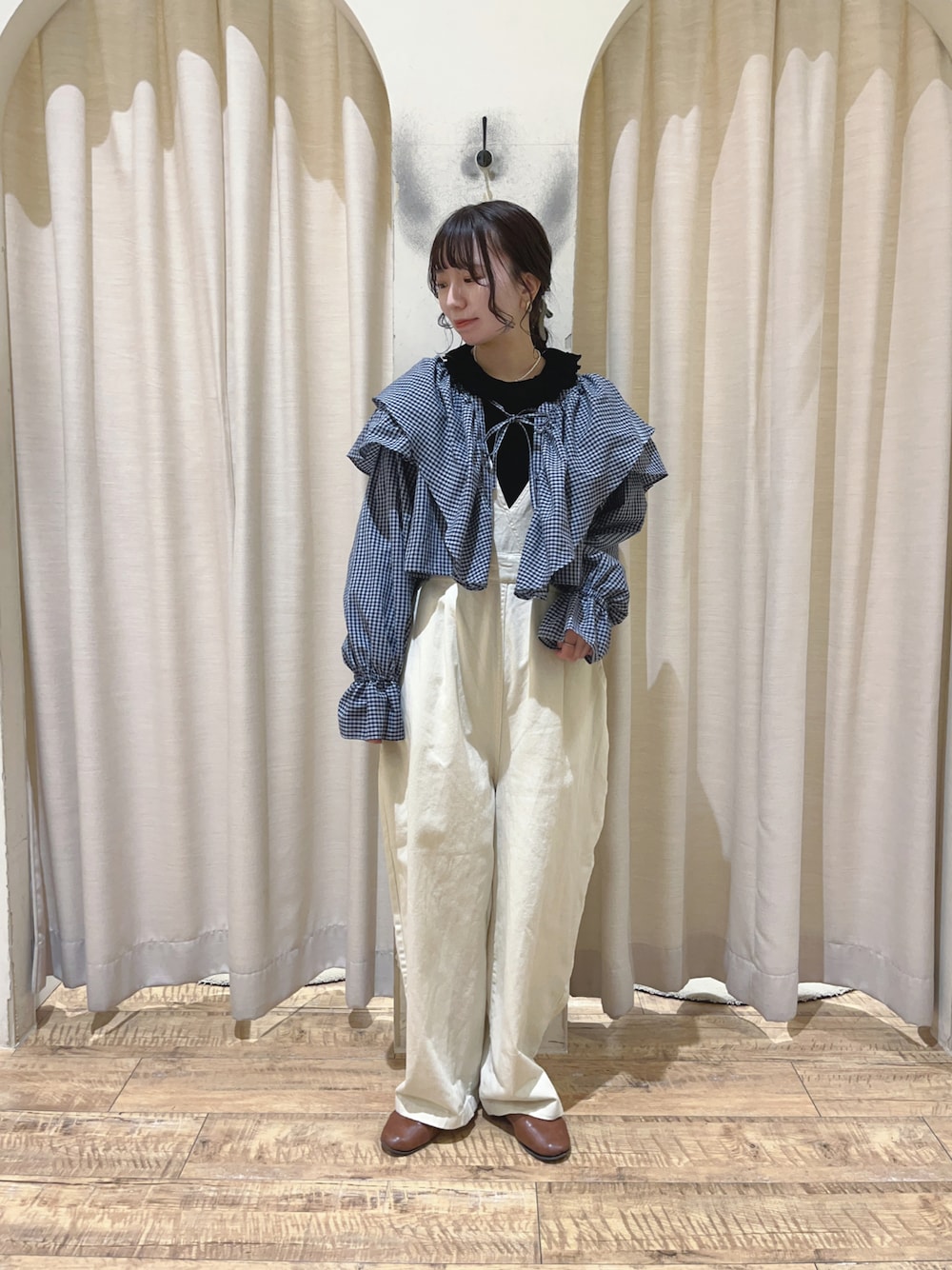 ご覧いただきありがとうございます🌨️ フリルカラーのブラウスを着用しました^^ フロントのリボンが可愛いですよね୨୧ ショート丈なのでバランス良く羽織りに 便利なアイテムです☺︎ シルエットが可愛いサロペットと合わせて ナチュラルガーリーなコーディネートにしました🌷 店頭やオンラインショップでご覧ください👀🛍