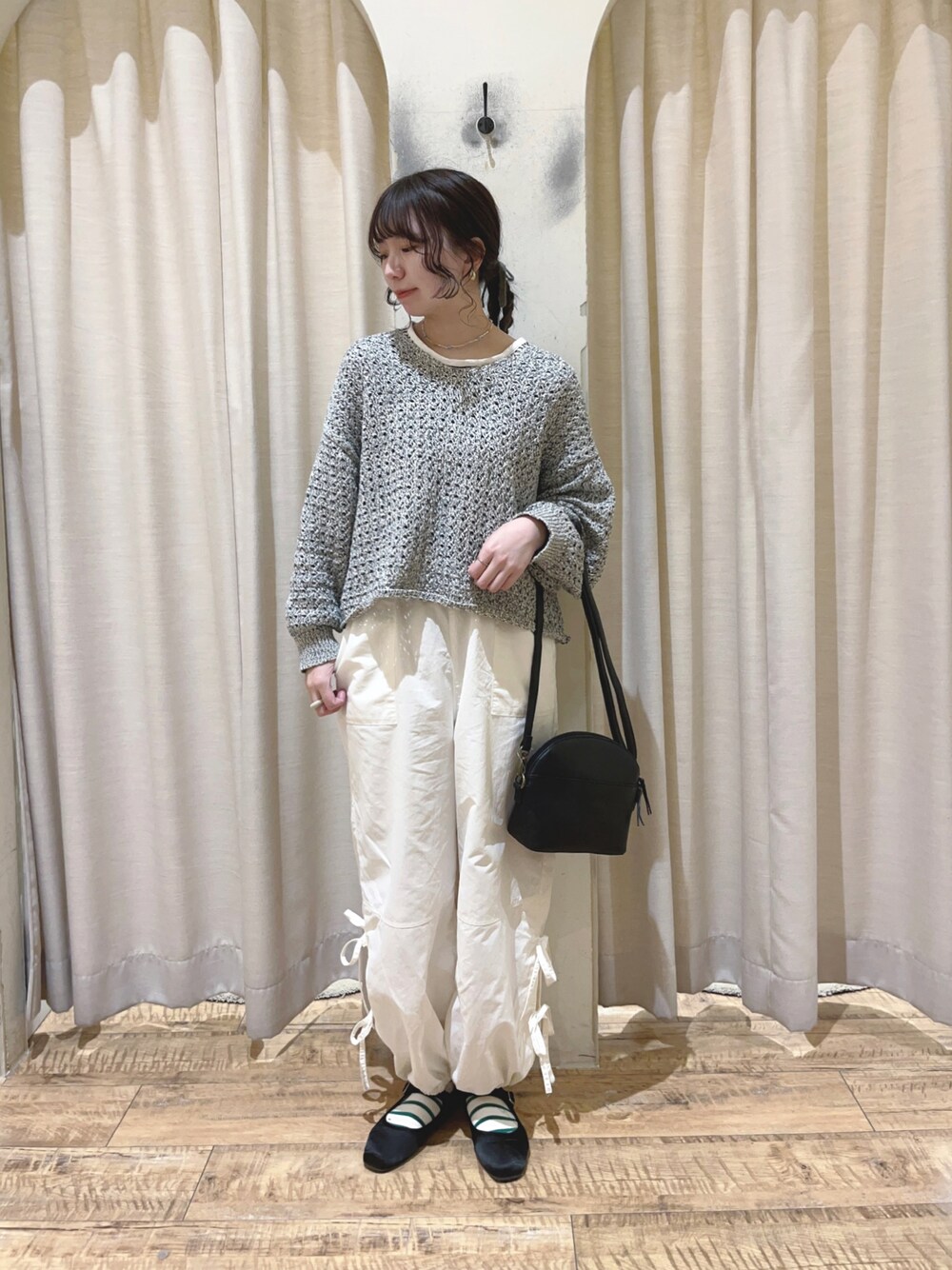 ご覧いただきありがとうございます🌷 いつかの出勤コーデ👀 前後2wayのニットボレロを着用しました^^ 綿混合の軽い素材が着心地もよく いますぐ着られる春アイテムです! パラシュートパンツと合わせてシンプルな コーデに୨୧ 裾のリボンがポイントになって可愛いですˎˊ˗ オフは透けるのでペチパンツ必須です🍦 店頭やオンラインショップでご覧ください🛍