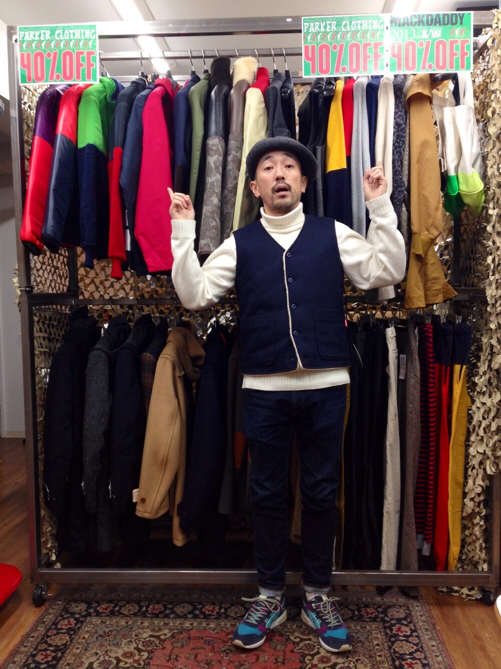 皆さん、僕は風邪です… いつも年の瀬が近づくと、風邪を引いてる気がしてます^^; 皆さんも気をつけて下さい 今日は暖かいスタイルです。 こちらのベストが、ウール地とボアのコンビで、 本当に暖かく脱げません‼︎ ウール地ボアベスト:MACKDADDY タートルネックニット:MACKDADDY スキニーデニム:MACKDADDY ベレー帽:HORDEN スニーカー:asics 今週末は原宿のマックダディー事務所にて、 サンプルセールと先行セールを行ってますよ(^^)