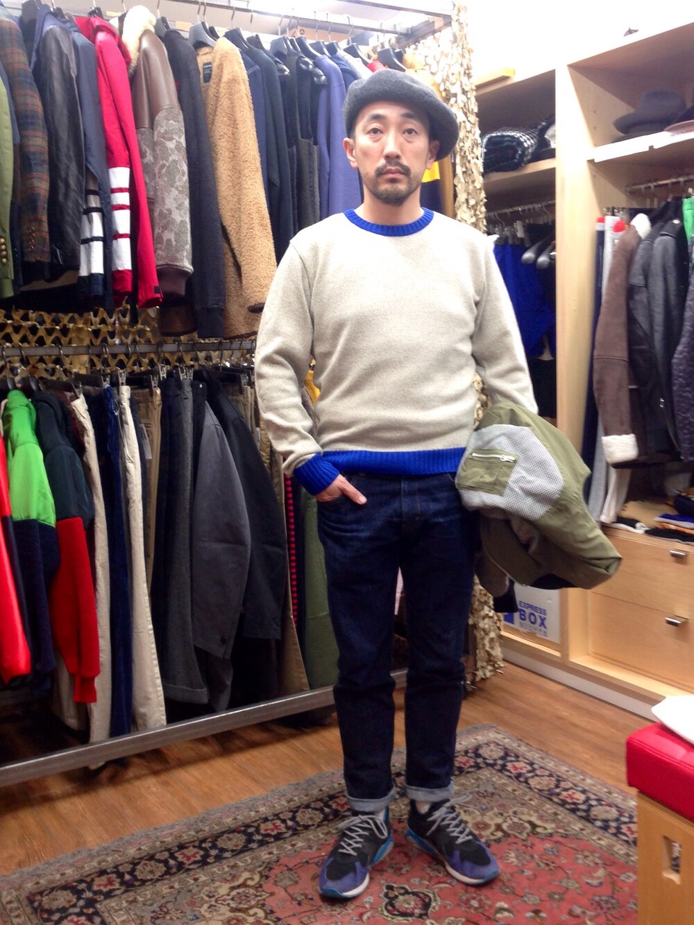 今日も動きやすいスタイルで、出勤しましま! やっぱり初売りは楽しいですね(^^) 今日の着てる薄手のニットは、ニットとしては珍しく、袖にクロスボーン柄のプリントが入ってて、ニットなのですがロンTの様に、カジュアルでスポーティーな着こなしも出来る、オススメのアイテムです! MA-1タイプ ジャケット:MACKDADDY クルーネックニット:MACKDADDY デニムパンツ:MACKDADDY ベレー帽:HORDEN スニーカー:asics 本年もマックダディーを、 宜しくお願い致します\(^o^)/
