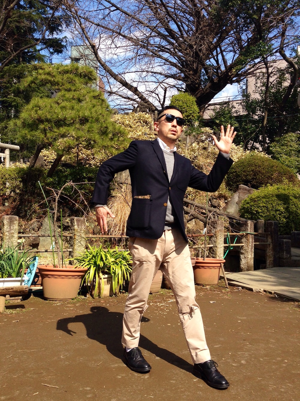 後ろの小山は、千駄ヶ谷の富士塚です🗻 天気が良くて絶好の登山日和ですね🚶 なかなかの急勾配を老若男女が、わらわら登っております(^^) 素敵ですね😍 今日はインナーのシャツ以外は、他ブランドなのですが、たまにはね👔 ピンガリンのボンテージパンツが、股上深くて超最高です! ブレザー:ブルックスブラザーズ BLACK FLEECE ウールニット:Maison Martin Margiela ボンテージパンツ:phingerin 靴:Tricker's サングラス:rayban