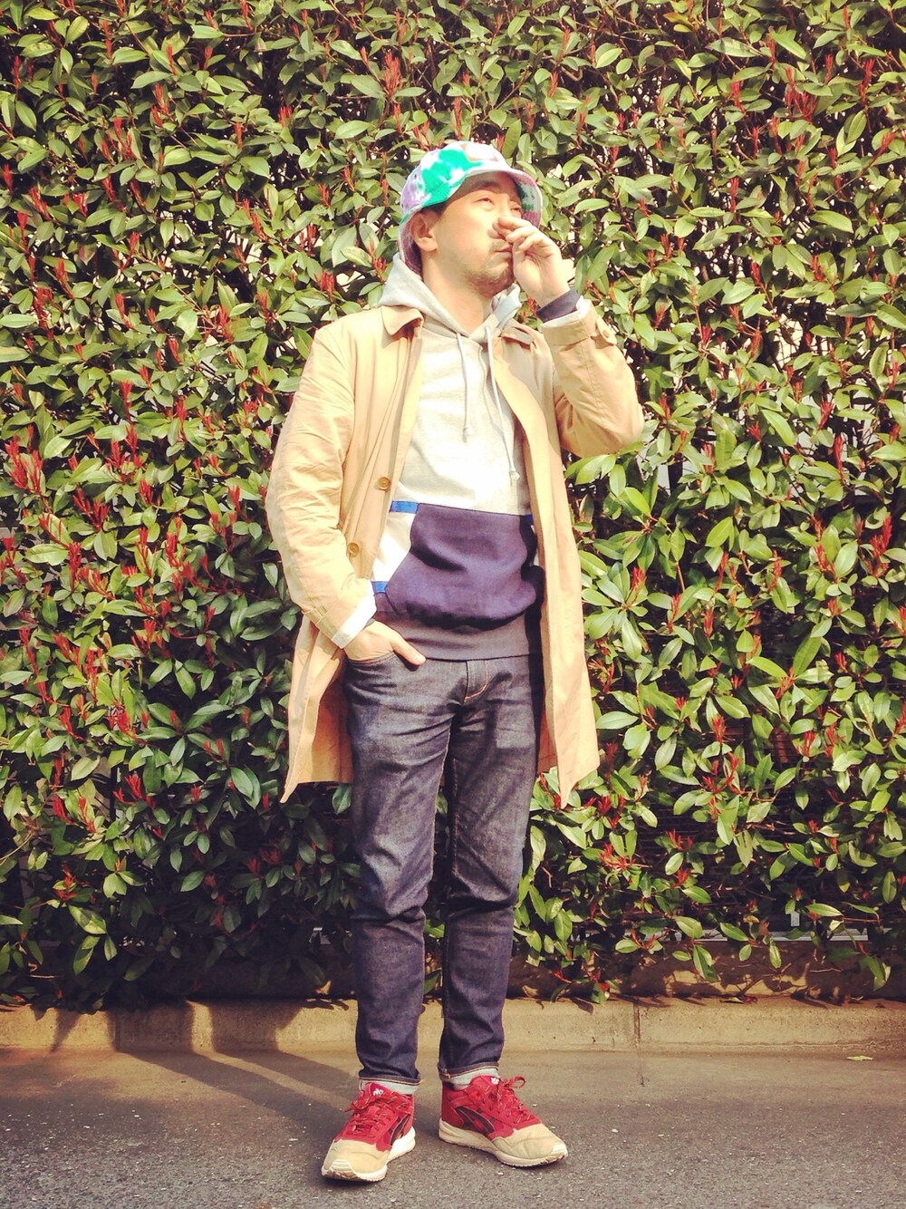 鼻かゆいです、僕。 皆さん、大丈夫ですか? 春の陽気が続いて気持ち良いのですが、 鼻だけが辛いです… 今日もステンカラーコートを着てます。 調子が良い物はずっと着たいタイプなのですが、 そうもいかないので、どうしても似たアイテムを 好む傾向な僕です。 ステンカラーコート:GOODENOUGH IVY フードスウェット:MACKDADDY スキニーデニム:MACKDADDY バケットハット:Milkcrate_Athletics スニーカー:asics