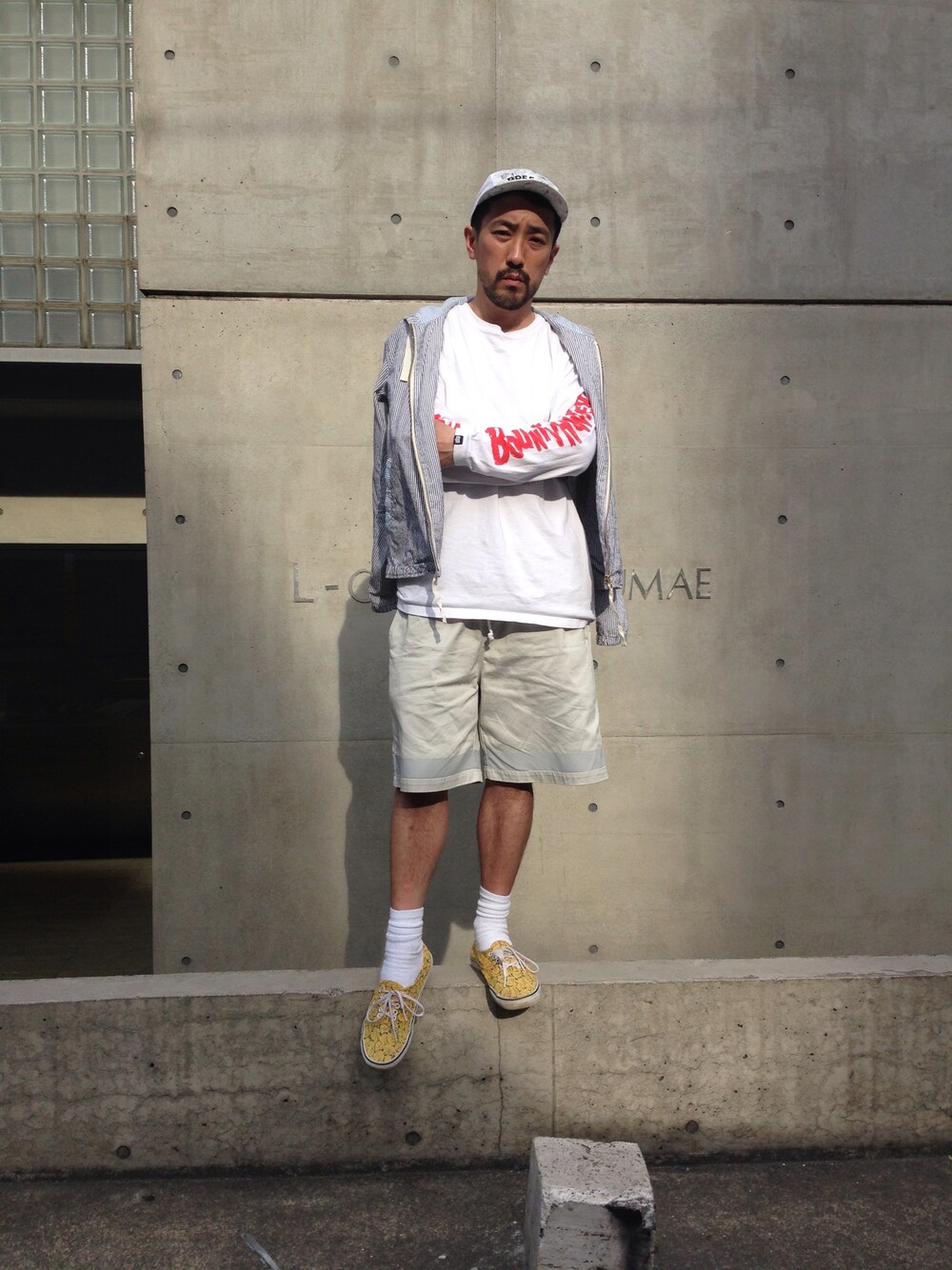 今日も暑かった東京。 ずっと外で打合せだったので、 今日の暑さは夏を感じました。 ショーツとロンTが気持ち良い。 けど夜は羽織る物が欲しいって、 今しか出来ないコーディネイトを 楽しんでおります。 フードジャケット:MACKDADDY ロンT:BOUNTY HUNTER チノショーツ:MACKDADDY キャップ:MACKDADDY スニーカー:KENZO