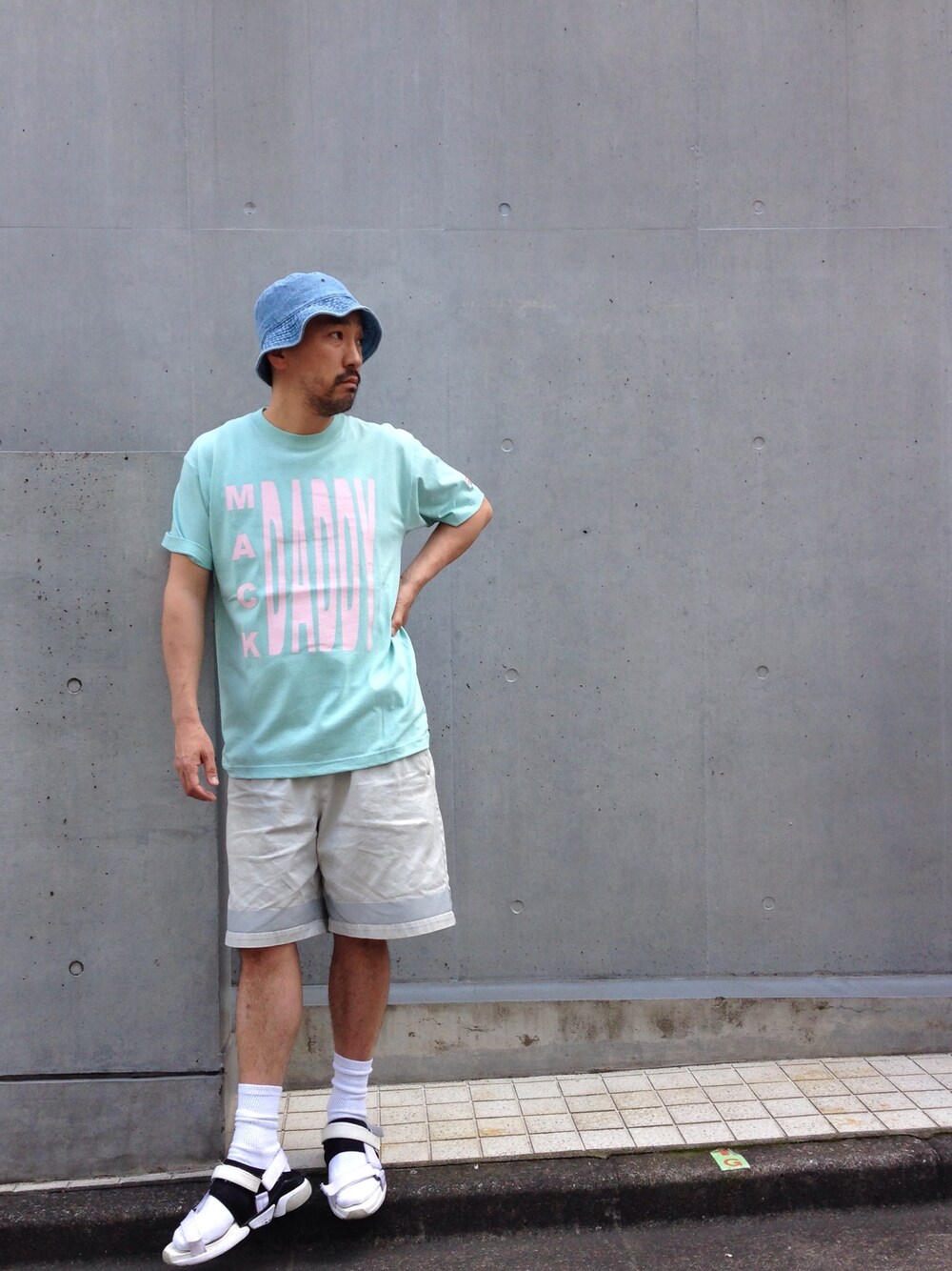 今日も東京は穏やかな気候ですね。 日中はTシャツとショーツで問題無い(^^) 本当に過ごしやすい👏 新作のTシャツの薄めのミントグリーンが綺麗です。 デニムハット:不明 Tシャツ:mackdaddy ショーツ:mackdaddy サンダル:ORPHIC