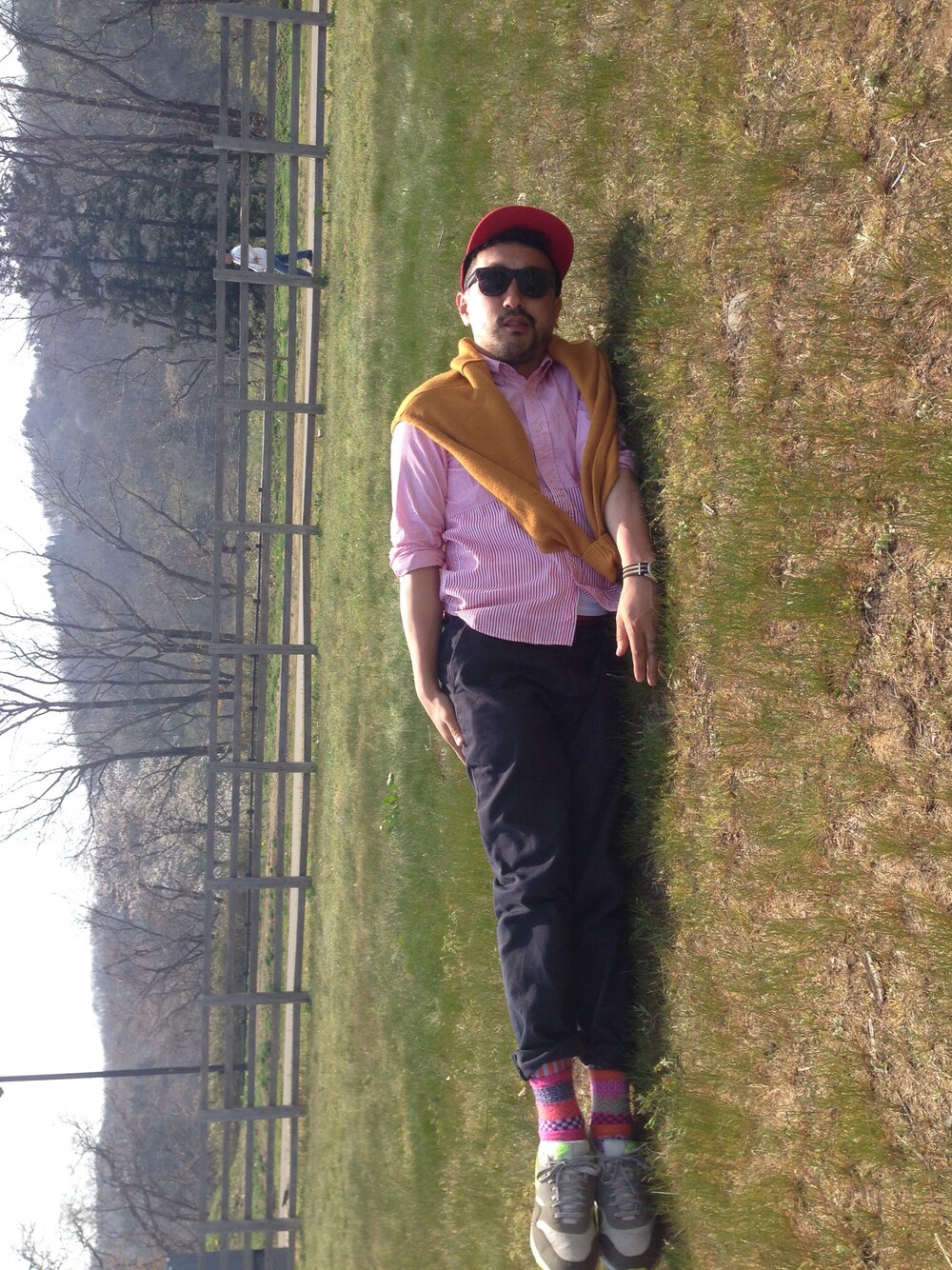 アラバキロックフェスから、おはようございます シャツ:マックダディー ニットセーター:マックダディー チノパンツ:マックダディー 予想外に天気が良いね