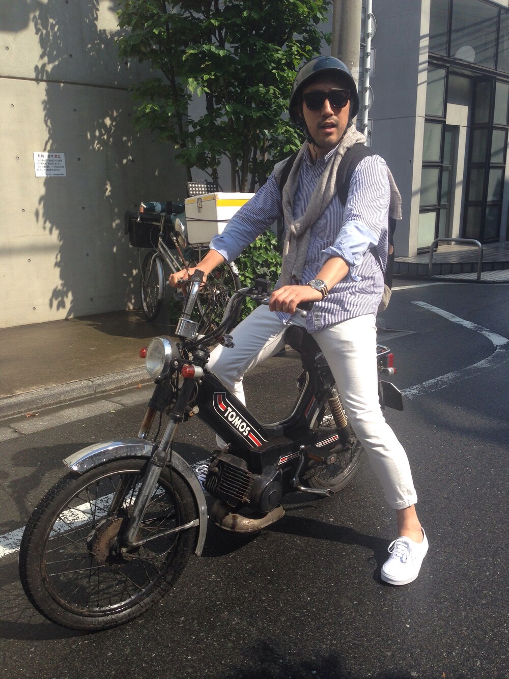 VIRGOのユウからTOMOS借りました。 なかなかです☻ 今日は爽やかにキメてみました。 コットンニットセーター:マックダディー ストライプシャツ:マックダディー ホワイトパンツ:マックダディー スニーカー:VANS 原チャリ:TOMOS ケガしない様に気を付けます