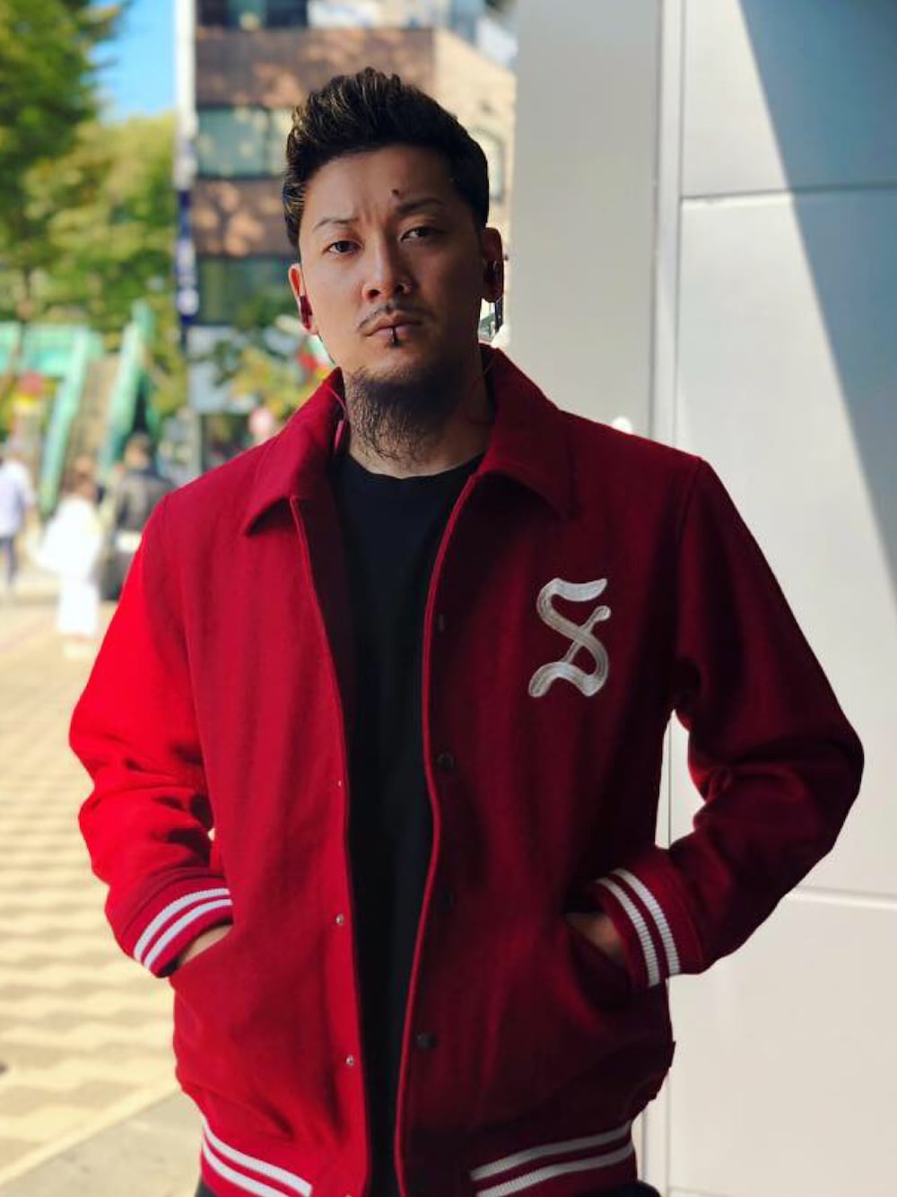レッド系のスタジャンを着用したメンズの秋コーディネートの1枚目の写真