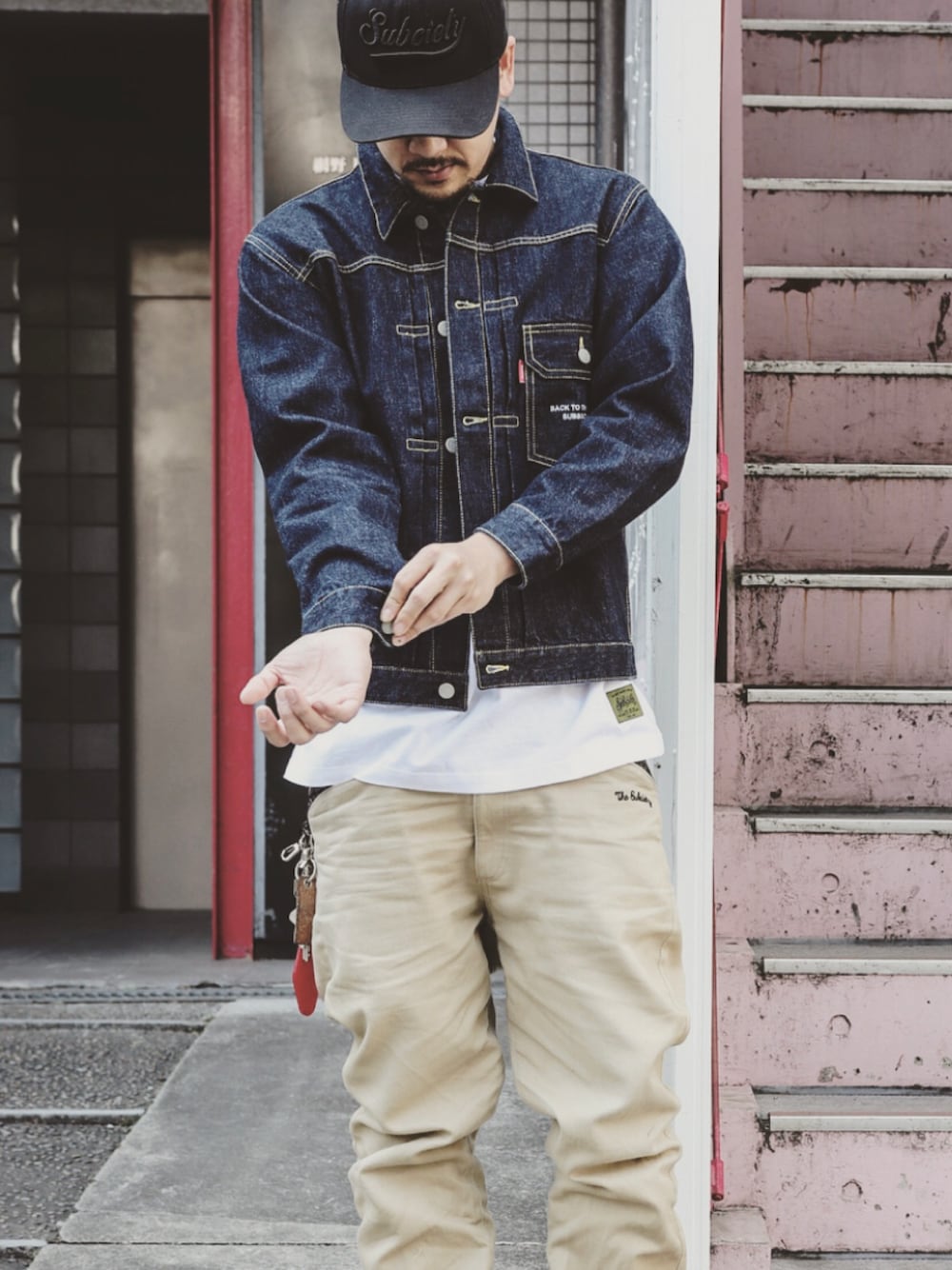 ストリートコーデ。 定番ながらタフな存在感を放つデニムジャケットにワークパンツの組み合わせはタウンユースでも引けを取らない。