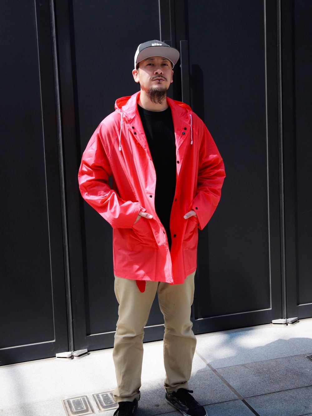 タウンユース向けに昇華したレインコートを軸にしたストリートコーデ。 雨の日でもこだわりを楽しめます。