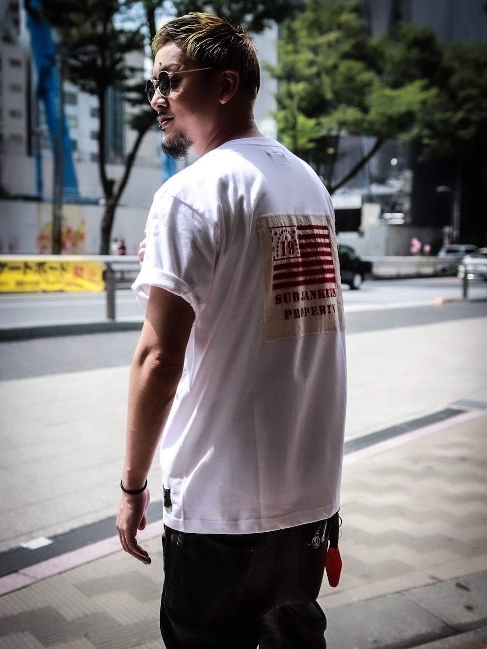 シンプルストリートコーデ。 米陸軍航空隊の40年代のボンバージャケットの背面に兵士自らペイントしたグラフィックをイメージしステンシルで表現。 背面には、部隊用アメリカンフラッグをステンシルでペイントした物を不時着時を想定してブラッドチット風に縫い付けている 1点1点違った表情をみせる一着。 タウンユースでも目を惹くTシャツです。