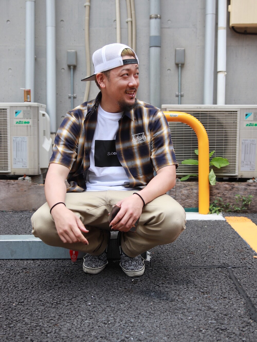 定番のスケータースタイル。 西海岸を彷彿とさせるボックスシルエットシャツはこの時期オススメ。 淡い色でのコーデで涼やかさアップ。