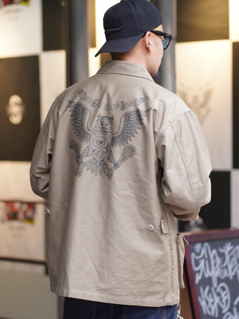 フィッシングジャケットから着想を得たBDUジャケット。 着古したような表情を楽しめるムラ感のあるバックサテンを採用。左胸、バックには『秘密結社』をイメージした『PROVIDENCE』のグラフィックをプリントで施しました。 サイズ展開-S/M/L/XL(CM) 着丈-68/71/74/77 肩幅-44/46/48/50 身幅-57/60/63/66 袖丈-59/60/61/62 素材- コットン100%