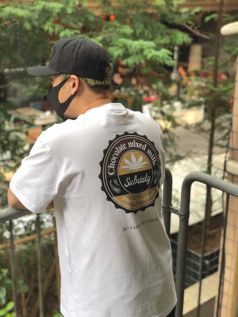 牛乳瓶の蓋をモチーフにしたグラフィック『"CHOCOLATE"』 中毒性のある成分を配合した製品のプロモーションをイメージ。 サイズ展開-S/M/L/XL(CM) 着丈-65/69/73/77 肩幅-41/46/50/54 身幅-49/52/55/58 袖丈-19/20/22/24 素材:コットン100%