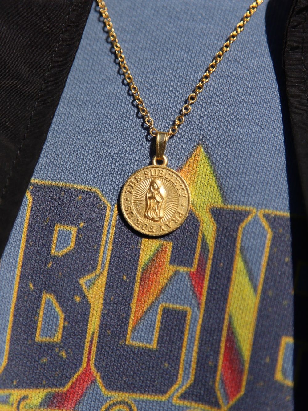 片面には『秘密結社』をイメージした『CRYPTO』のグラフィック、もう片面には『MARIA』を象ったコインネックレス。 「THE SUBCIETY」「PRAY FOR US」の文字を円状に刻印。 アジャスター付きで長さ調節が可能。 サイズ展開-FREE(CM) チェーン幅- 0.8 チェーン長さ- 22 トップ幅- 2x2 素材- 真鍮