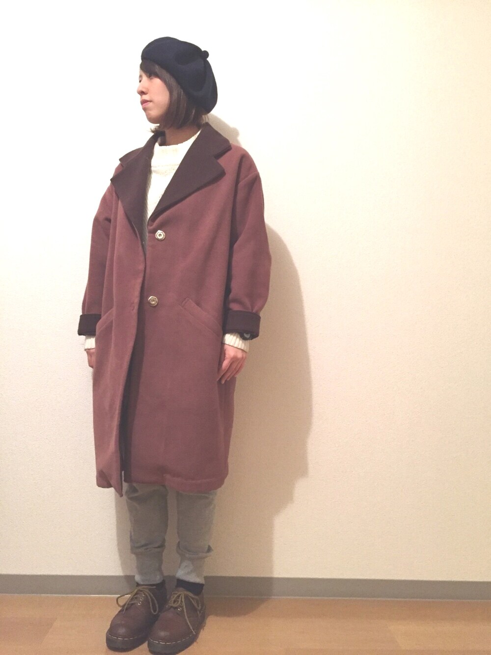 女っぽいチェスターコートに、 カジュアルなスエットパンツを合わせ、 ちょっとはずしたコーデにしました。 靴は古着屋でみつけたデットストックの イングランド製Dr.Martensです。 これからの春に向けて大活躍間違いなしです。