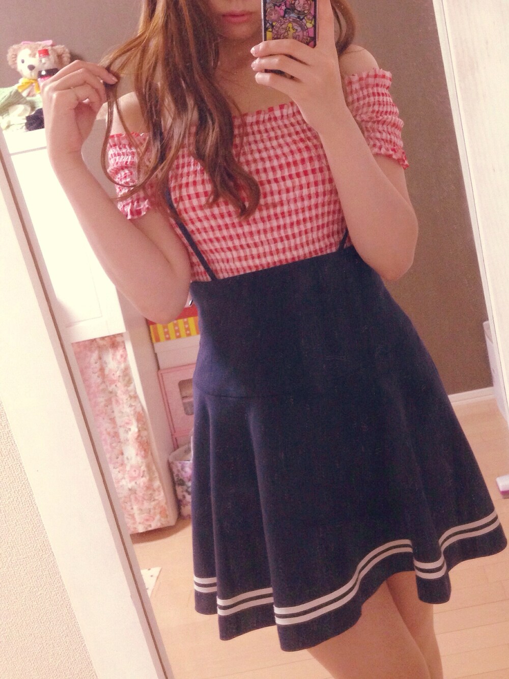 ショップで試着したときから、 この組み合わせは神!って 思ってたコーデ😂💞 赤ギンガムにネイビーのマリンSK 超かわいいです❤️🙈 オフショルなのも最高(∗ᵒ̶̶̷̀ω˂̶́∗)੭₎₎̊₊♡ あと、髪の毛染めてきました😎☀️ ブリーチしたからすごく明るい😲💫 今年の夏も派手派手でゴーゴーです!⁺✧.(˃̶ ॣᵕ ॣ˂̶∗̀)♡