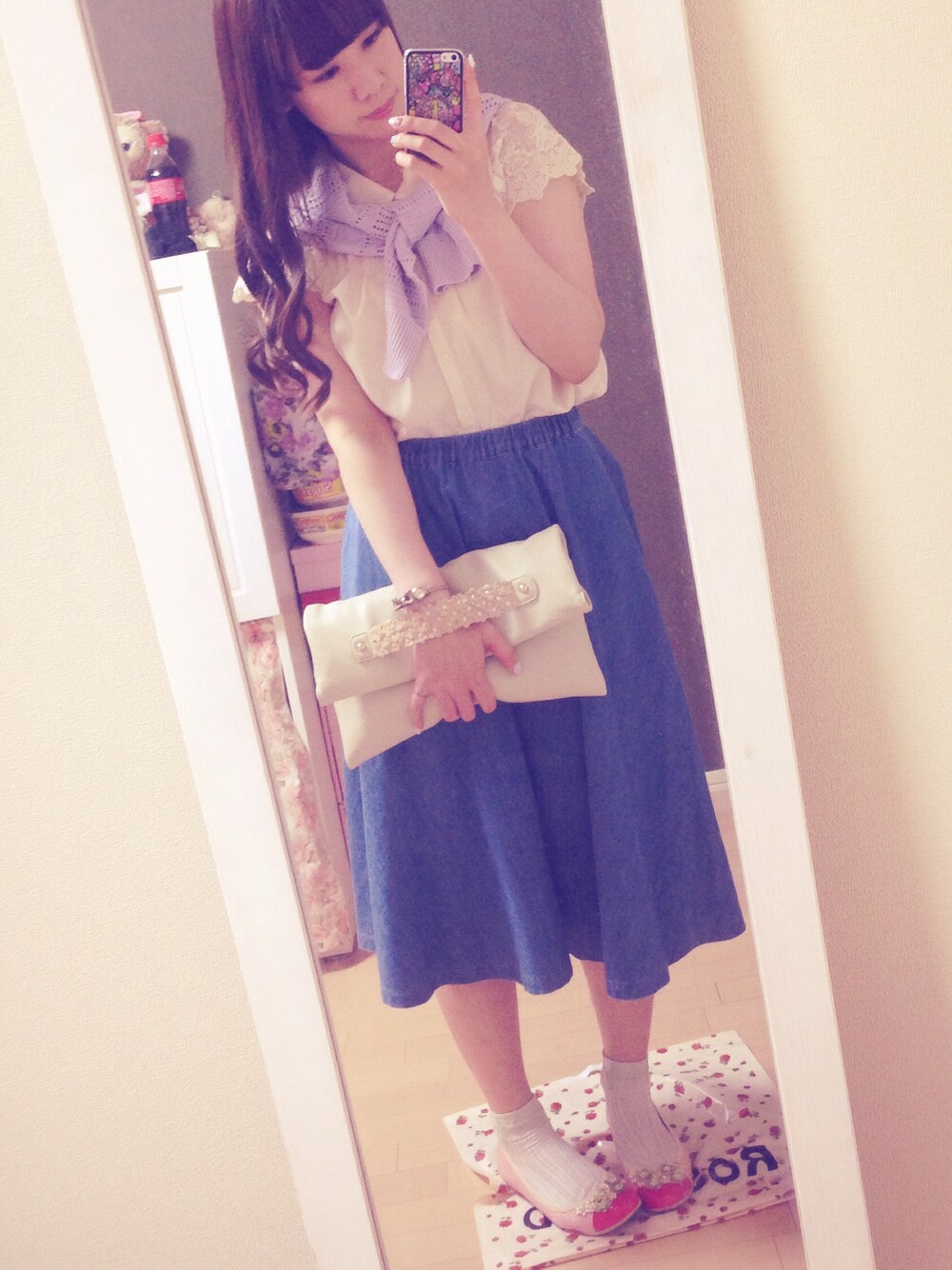 暑い( ´›ω‹`)☀️ 梅雨の晴れ間はありがたいけど、 もう夏じゃん!暑い〜( •́ㅿ•̀ ) 私夏生まれなんだけど、夏は嫌いで、 春とか秋の方が好きなんですよ。 でも今年の夏はやりたいこといっぱいあって、浴衣着てお祭り行きたいし、花火もしたいし、新しい水着買って海も行きたいし、プールも行きたいし、BBQもしたいし…! あ、なんか楽しくなってきた(⁎˃ᴗ˂⁎) 今日は、お気に入りのデニムスカートをガーリーにコーディネートしてみました(•ө•)♡ デニムだしウエストゴムだしカジュアルになりがちだけど、クラッチとブラウスで女の子っぽく🐰🎀 金曜日だ〜! あと一日がんばろう〜(⁎˃ᴗ˂⁎)💞