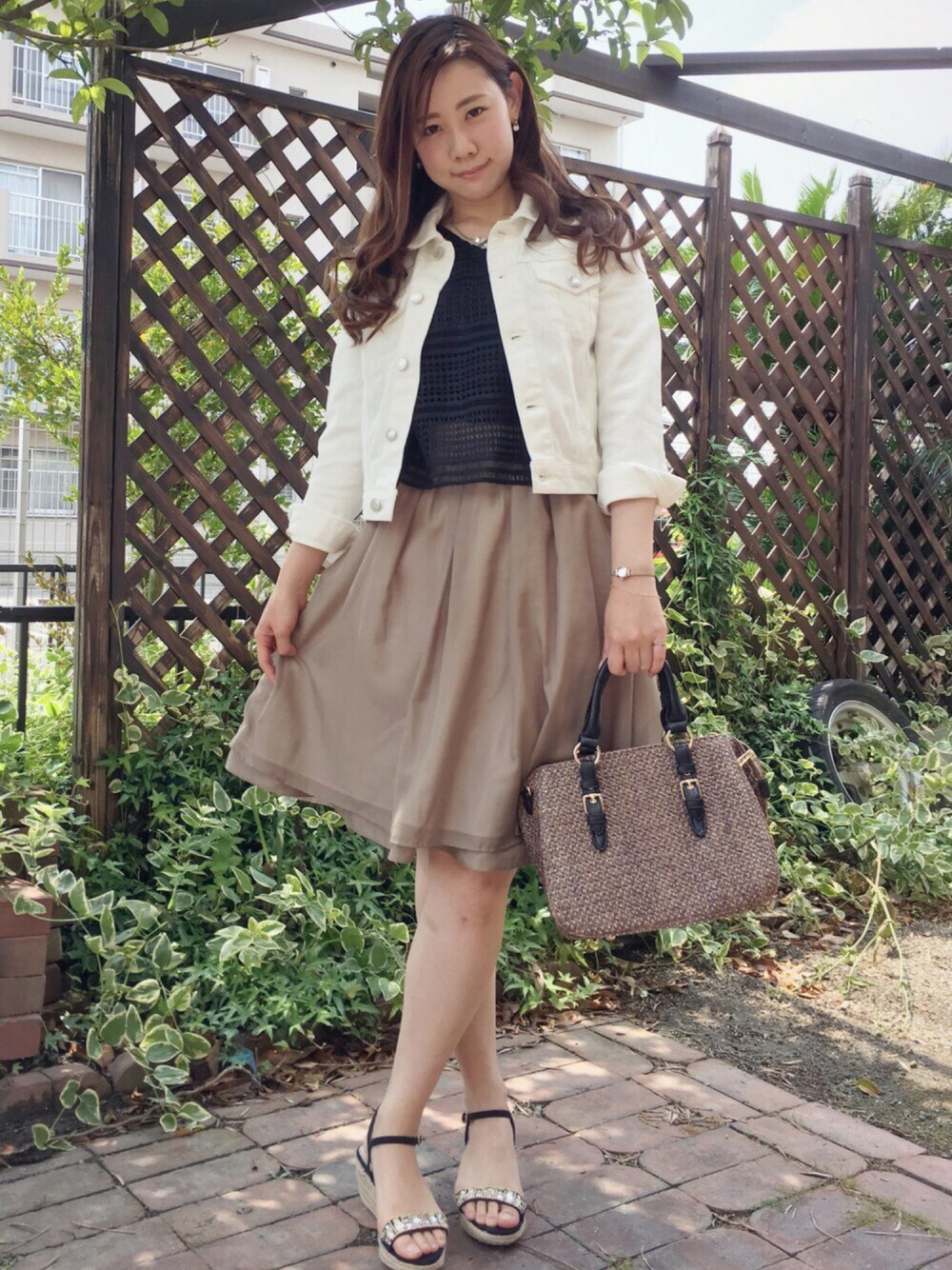 オレンジのスカート履いてたら、母に「なんか違う」って言われたのでカーキにしてみました♪ このスカートほんと使える〜♡生地も柔らかくていい♡カーキと黒って相性いいな〜👍🏻✨ 夏に大活躍な予感のかごバッグは、いつもなら絶対白を選ぶけどブラウン×ブラックにしてみました👜この大きさいい!でっかいお化粧ポーチもペットボトルも入る♡色ち買いありかも…