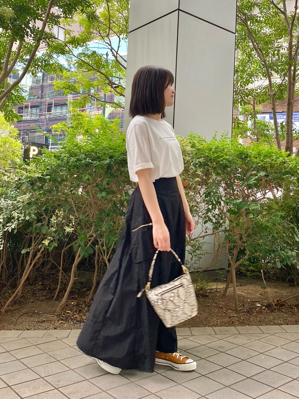 ブルゾン素材のスカートを使ったカジュアルコーデです スカートは長めで広がりがあるため、トップスを全てインさせるとすっきり見えします マスタード色のCONVERSEが可愛いです(^^)