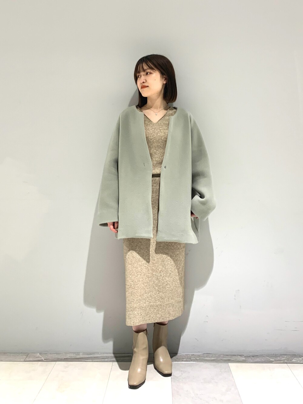 柔らかい配色で揃えたキレイめコーデ🌿 トップスとスカートはセットアップで着用できて、別々でも使える優秀アイテム◎ コートはミドル丈のゆったりサイズだけど、軽くてストレスフリーな着心地が嬉しいポイント^ ^