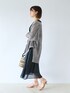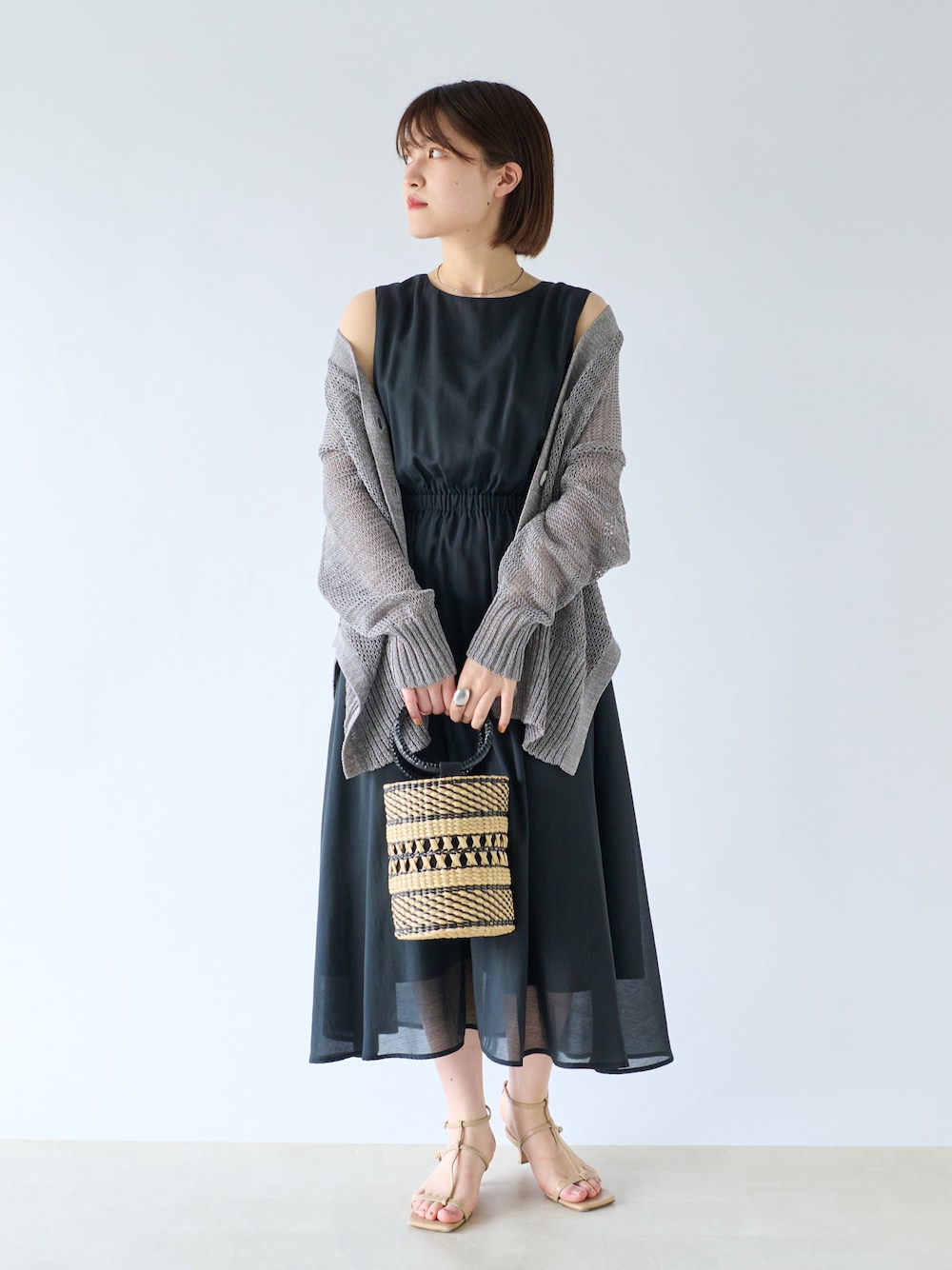 RIVE DROITEで大人気のサイドスリットカーディガンを使った大人コーデです。 黒のワンピースを合わせてモードな印象にしました。 あえてかごバッグを使うことでリゾートチックなスタイルになります。