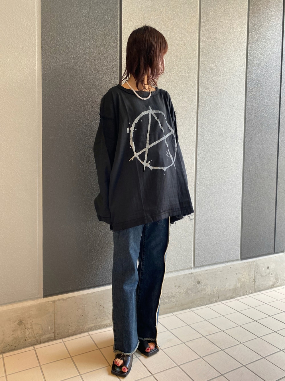 👕: TheATeR 👖:Maison MIHARAYASUHIRO 👡:AULA AILA TheATeRのガーゼビックTシャツは切りっぱなし加工、ほつれる糸でパンクに🖤🎤
