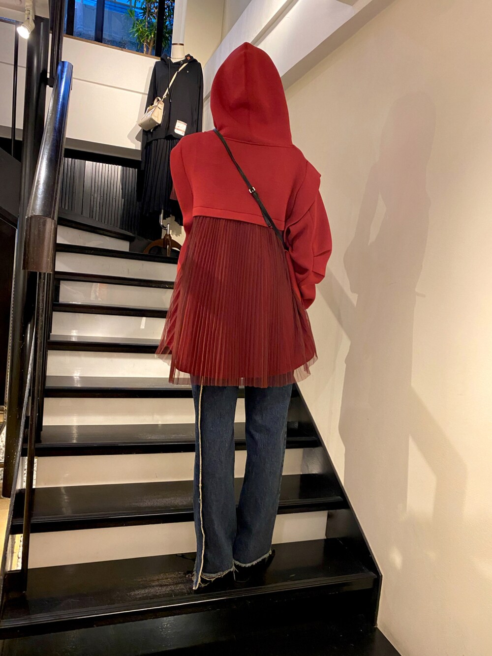 👕:AULA AILA 👖:Maison MIHARAYASUHIRO 📱: ajew AULA AILAのフーディは後ろがチュール&プリーツ🌹 切り返し部分から身幅が広がり、ふわふわと動きが出るのが女性らしいです👩🏻🦰♡ フードも大きく、被ると華奢見え👀