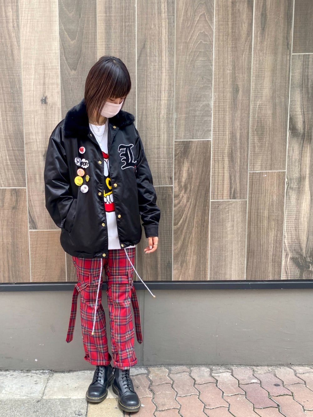 🧥: STUD MUFFIN 👕: STUD MUFFIN 👖: TheATeR STUD MUFFINのMA-1は襟部分は黒、裏地はオレンジの起毛でふわふわで暖かいです☺︎ バッジやワッペンなどの装飾ががついて、ポップでかっこよく🌟 TheATeRのボンテージパンツはボタン付属のため、丈の調節ができて2Wayで着用可能🙆♀️ ウエストは紐で絞ることができます! カジュアル、ストリート、モード、パンク…どの系統にもマッチするパンツです❤️🔥