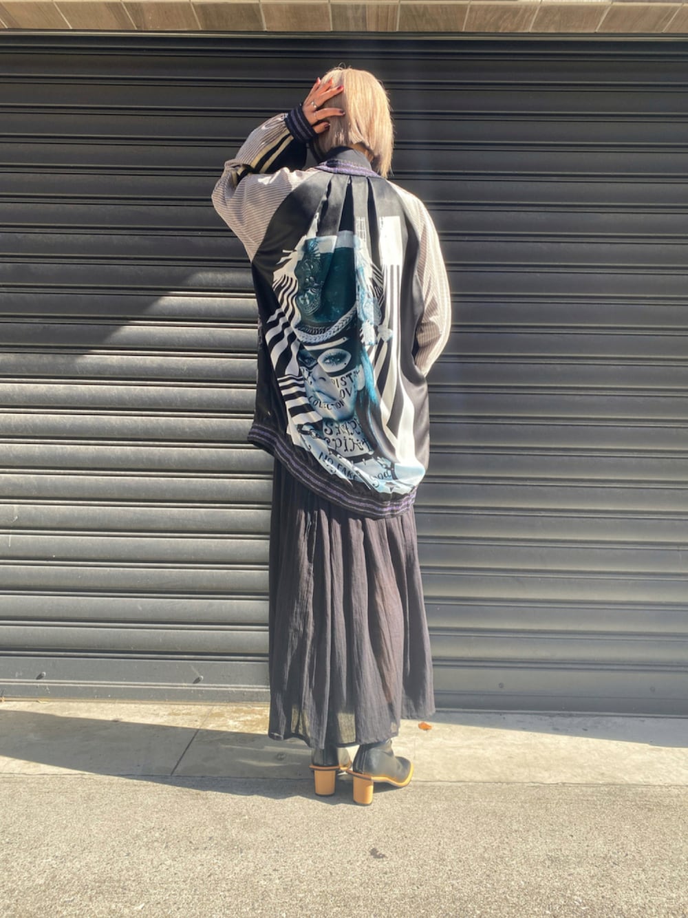 outer:SHARE SPIRIT skirt:KMRii boots:AULA AILA SHARE SPIRITのスカジャンはキュートなサーカスガールのバックプリントが推しポイント🎪 ラインがラメパープルなのも! KMRiiのスカートは166cmの私が着用でくるぶし丈なのでかなりロング丈です🍃 ペチコートは縫い付けられていて、程よい透け感であっさりと、そして女性らしくが叶う素敵なスカート🥀