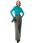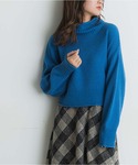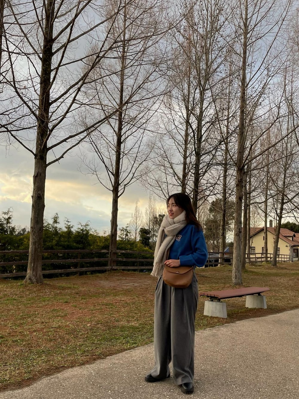 ブルー×グレー ショート丈のセーターとハイウエスのパンツで脚長効果🤍
