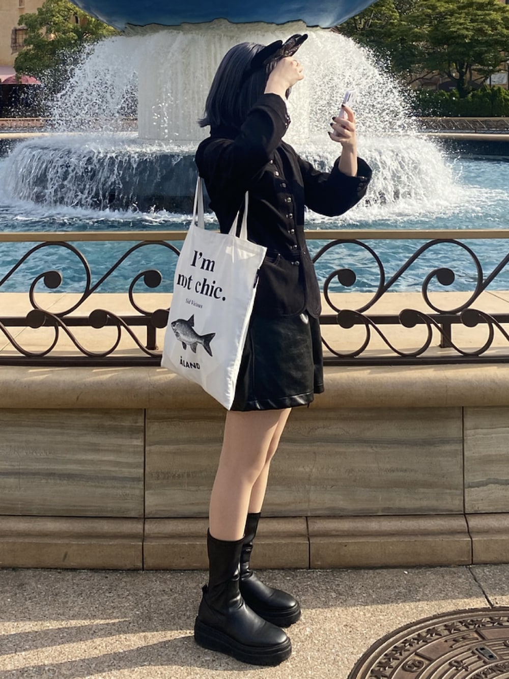 ブラック系のシャツ/ブラウス、ホワイト系のトートバッグ、ブラック系のパンツを着用したレディースの春コーディネートの1枚目の写真