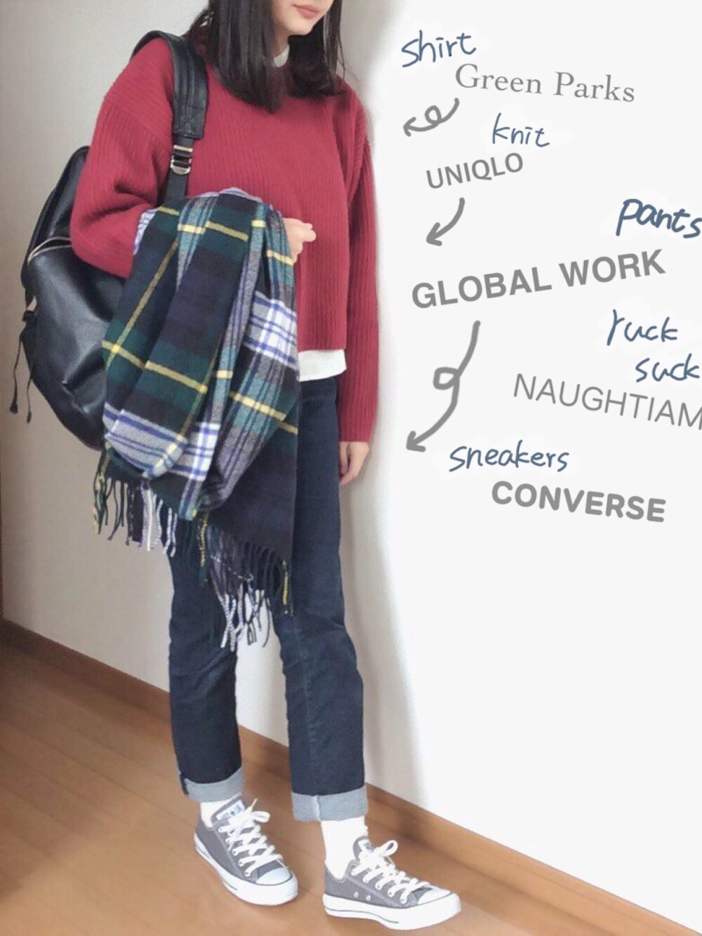 13 / 9 ピックアップタグ第2弾 お気に入りのユニクロユーの赤ニット ラムクロップドクルーネックセーター 白シャツの襟と裾をちら見せして デニムとのバランスをとりつつ、、 チャコールグレーのコンバース、 冬でもしっかり履きまわします Instagram @daily_an_