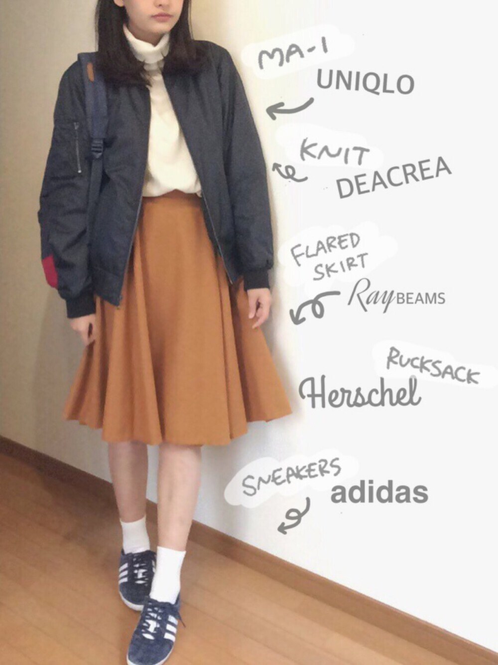 11 / 7 お気に入りのフェミニンなフレアスカート どうにかカジュアルに着こなせないかと 組んでみたのが今日のコーデ。 ネイビーのMA-1は¥2,000でゲットした ユニクロ MENSのSサイズ。 オーバーサイズはシルエットが難しいね、、 Instagram @daily_an_