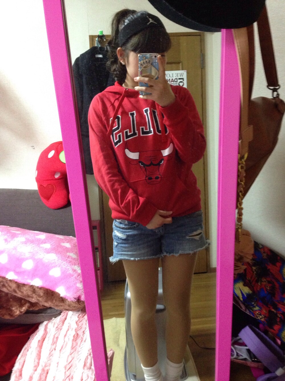 お姉ちゃんからジョーダンのヘアバンド貰ったので、ポニーテールして付けてみました✨ 寒そうに見えるけど、、、ちゃんとタイツ履いてるんで寒くないですよ。。笑