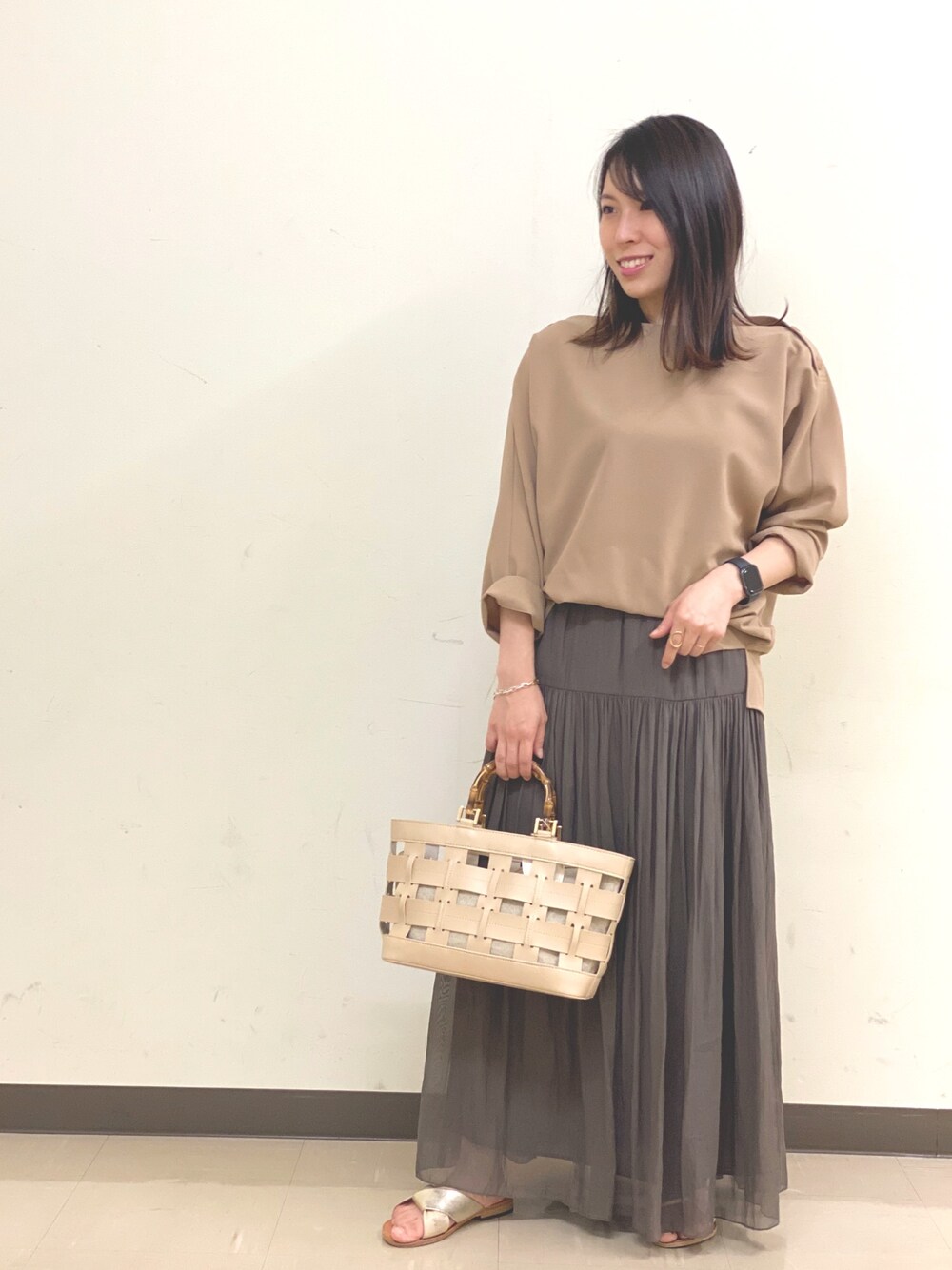 同系色コーディネート⭐︎ このスカートはスタッフ人気が かなり高いアイテム! 腰回りの切り替えでギャザースカート 特有の着太りが解消!! 今まで苦手意識のあったギャザースカート 最近は結構な頻度で愛用してる♪ 今年らしいシアー素材も目を引く⭐︎