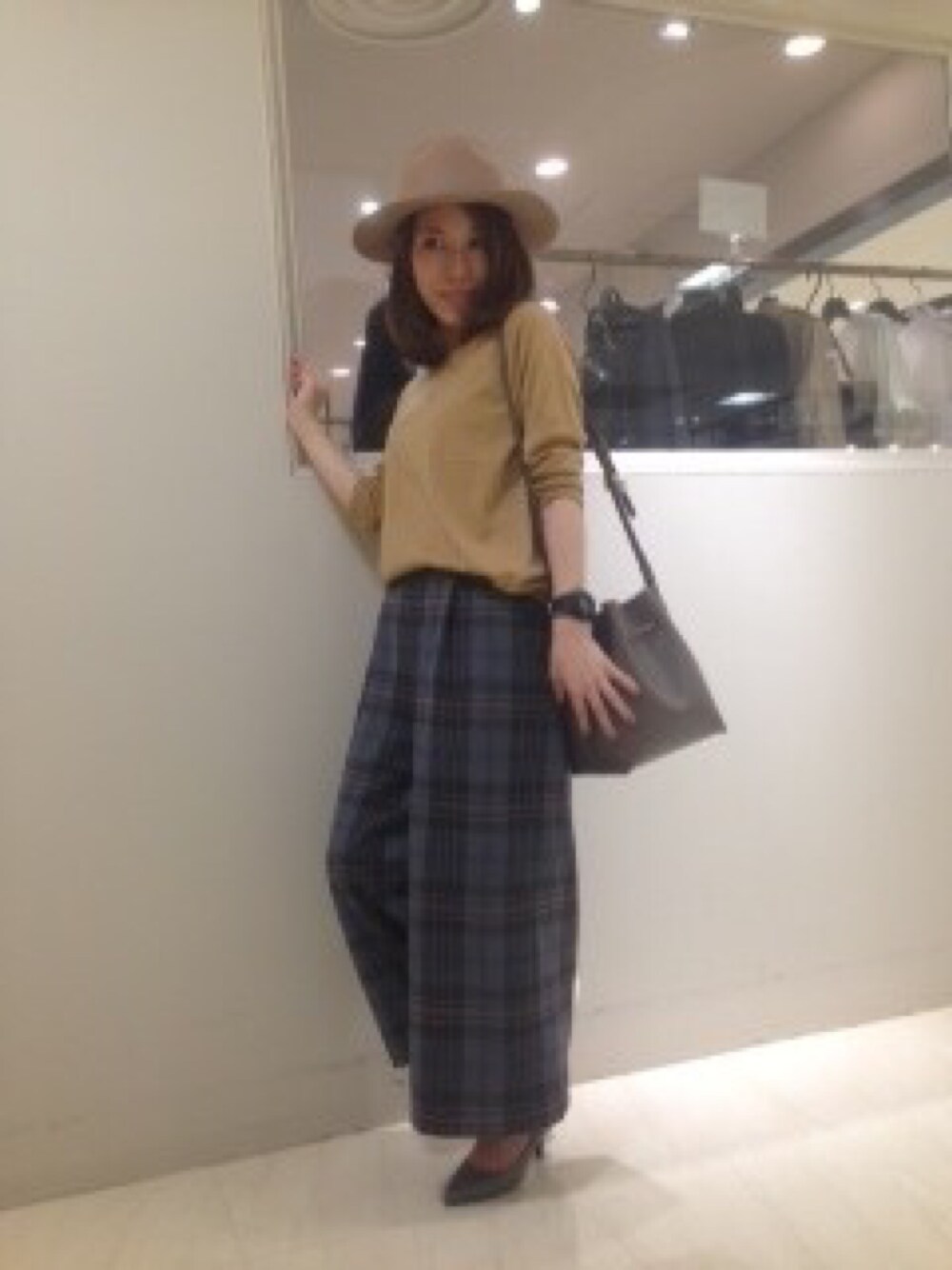 本日はグレートーンで 配色された秋色チェックの ガウチョパンツを使ったコーディネートです。 落ち着いた色味ですが アクセントになるチェック柄が 素敵ですよね☆ 秋らしくキャメルの シンプルニットと合わせてみました。
